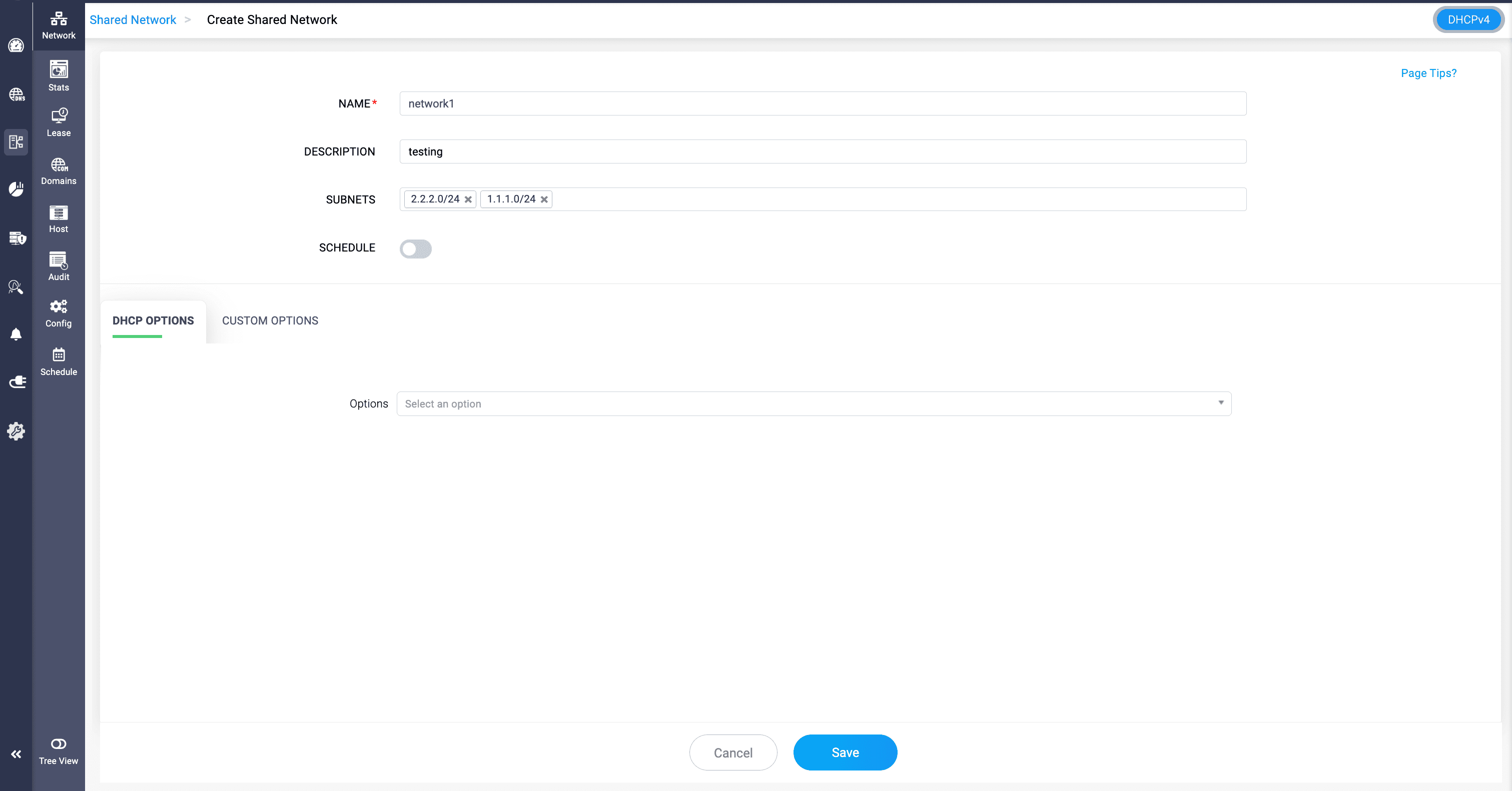 • To create a new shared network, go to DHCP-> Network-> Shared Network.
