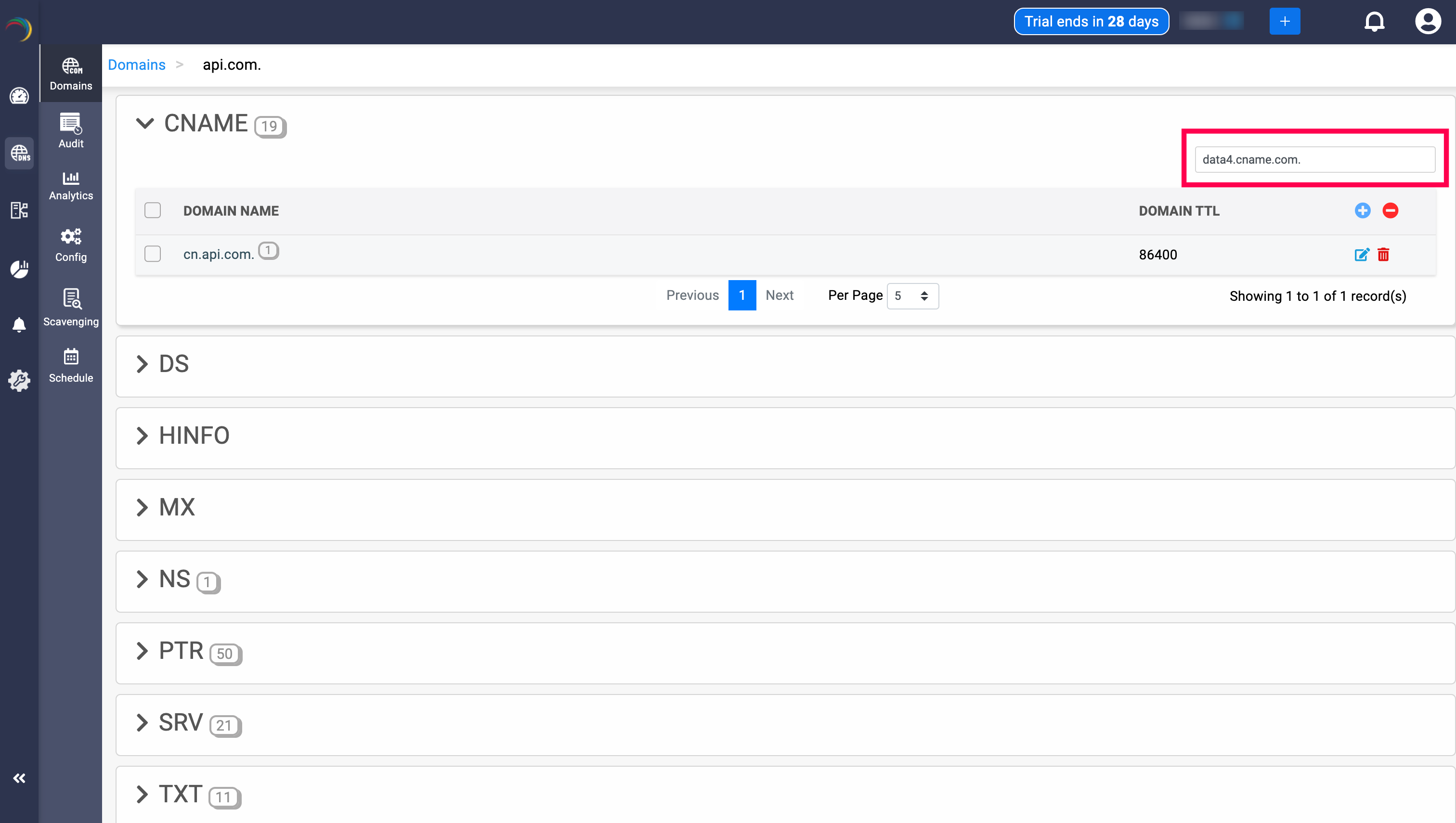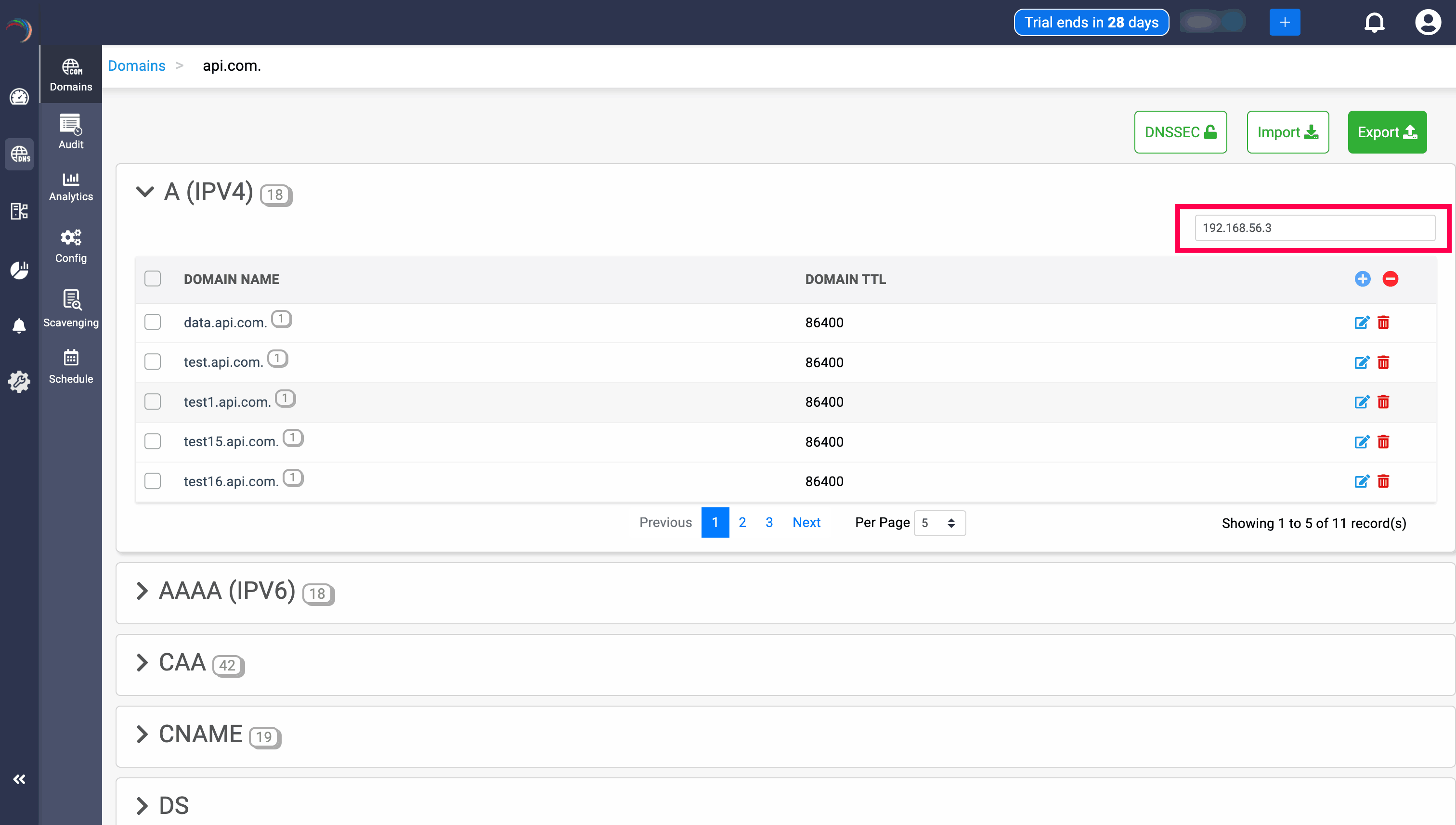 - This will take you inside that particular domain, displaying various types of records supported by DDI Central like A, AAAA, ANAME, CNAME, etc.