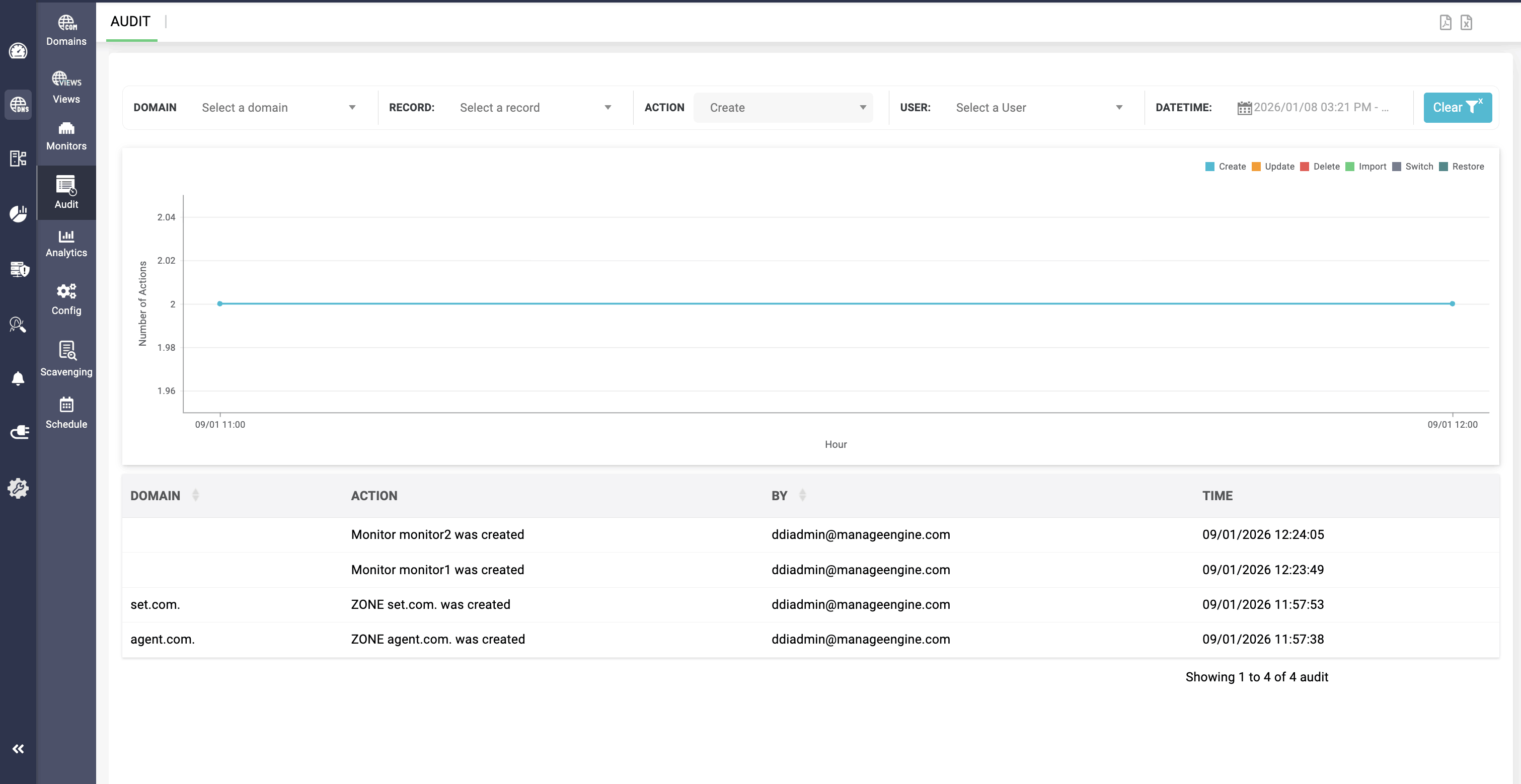 The DNS audit log provides six different action-based filtering options, allowing network administrators to filter and view specific DNS activity logs across the network. This enables more focused visibility and streamlined monitoring. The following actions can be selected for review: