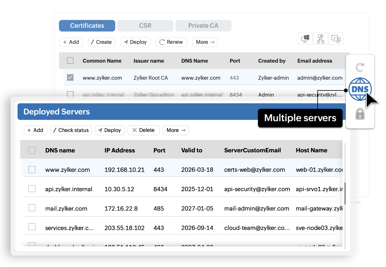 When renewing certificates, see exactly which servers need the updated certificate deployed. View deployment locations, check synchronization status to ensure all servers run current certificate versions, and identify servers requiring updates. This multi-server tracking prevents the common problem of missing deployment targets during certificate updates.