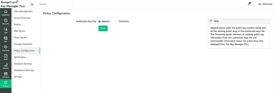 You can create a policy - whether you want to remove the existing keys and have a fresh, completely managed start or leave the existing keys undisturbed. Once the policy is set, Key Manager Plus will create and deploy new keys in accordance with it.