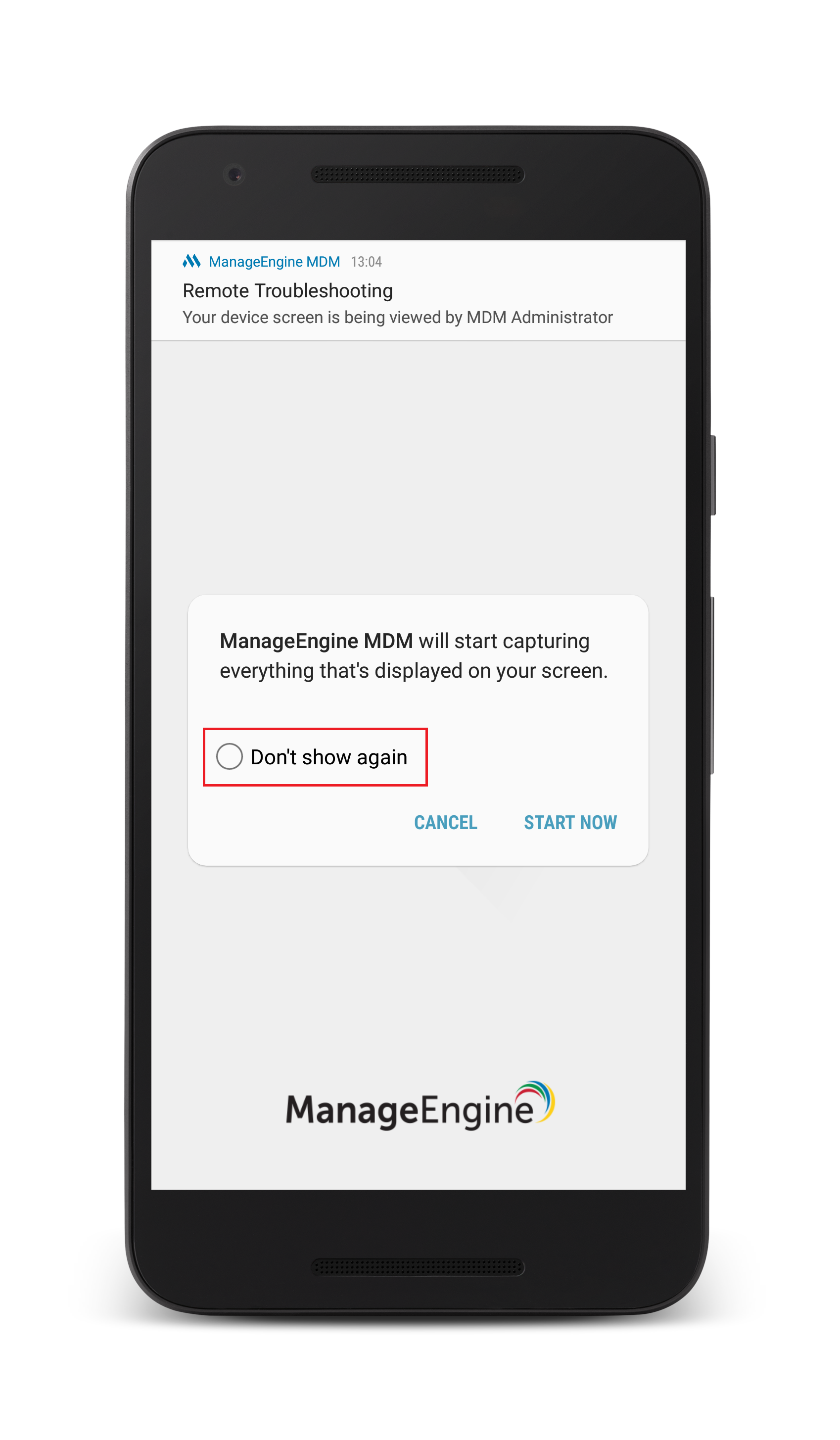 However, in case of unattended devices such as devices used for self-service, digital signage etc, that are not in the hands of any employee, you’d want to initiate a remote session without any user intervention. You can do that by selecting the checkbox Do not show again when shown the prompt to initiate the remote session is shown on the Android device. Not applicable for devices running Android 10.0 or above.