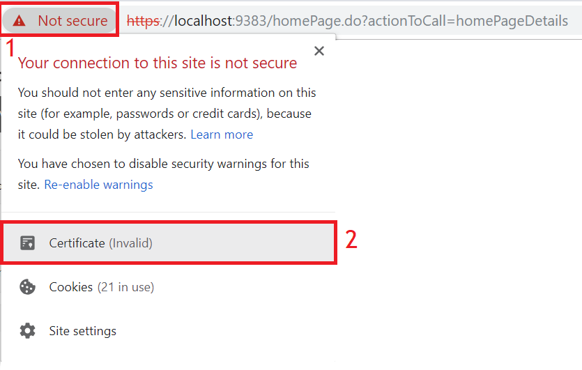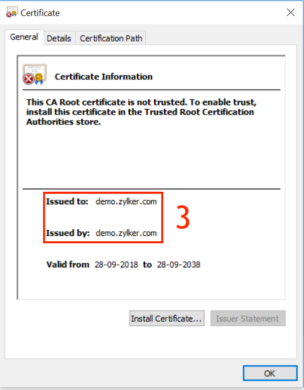 Open Google Chrome and login to your server on the HTTPS channel(port 9383/8383) and click on icon present to the left of the Not Secure option. Click on Certificates option from the dropdown. If the parameters Issued by and Issued to are the same, then you need follow the steps below to manage iOS 12 devices. This process may vary on other browsers.