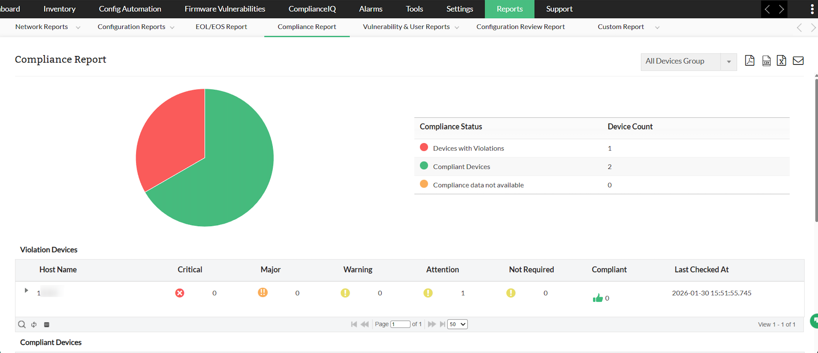 Reports play a pivotal role in any operation, as they offer a comprehensive overview of the entire process. Network Configuration Manager provides a dedicated compliance report that allows you to monitor the real-time compliance status of devices.