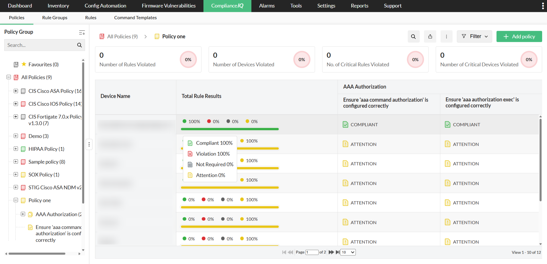 With Brocade switch management configuration, ensure Brocade switch configurations are free from vulnerabilities by auditing them for compliance with internal and external policies. Network Configuration Manager provides default compliance policies such as CIS, SOX, HIPAA, and PCI DSS. On top of that, you can configure Brocade switch by creating custom compliance policies, apply them on Brocade switches and get alerts when a policy/rule is violated.