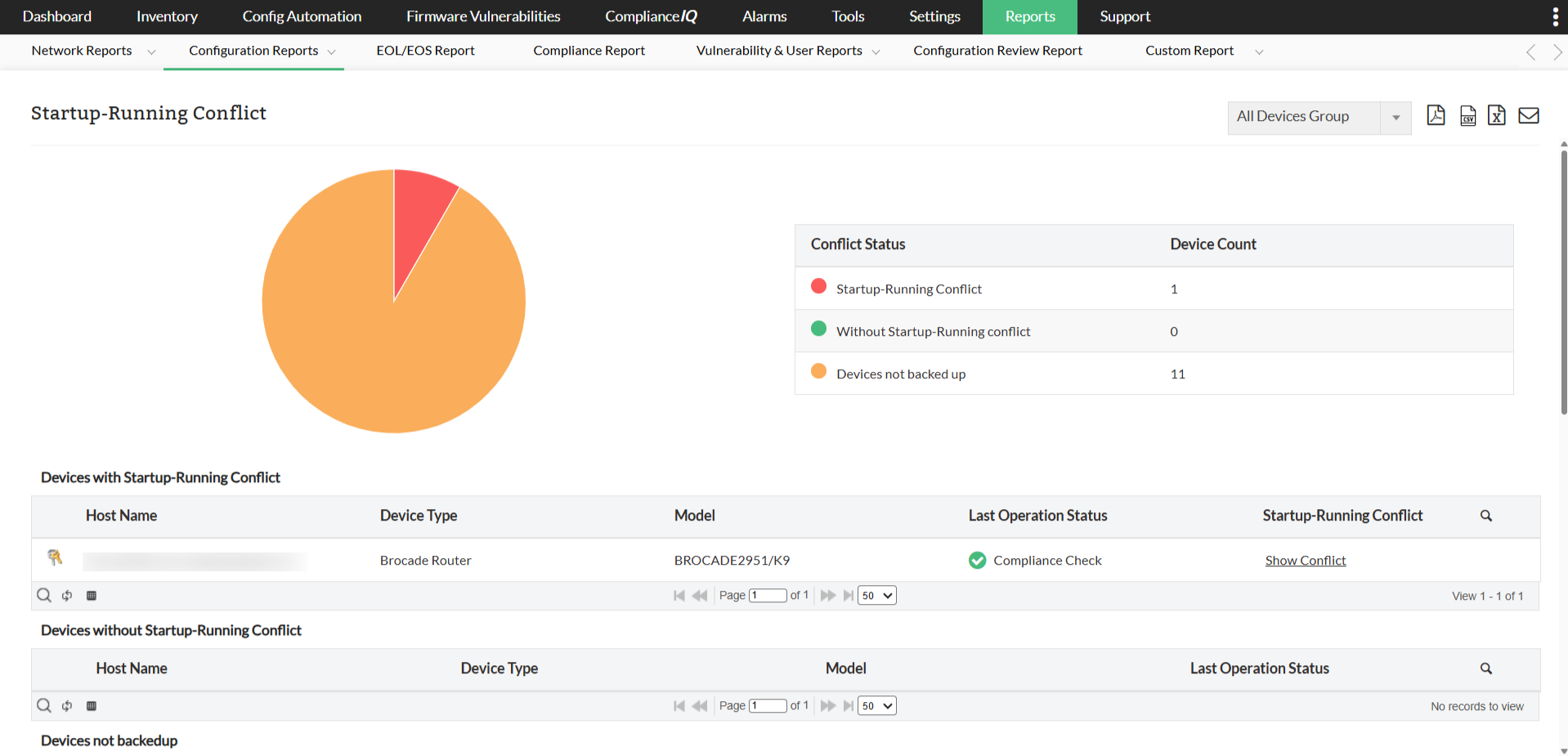 Configuration audits and reports are an integral part of keeping your network secure. Network Configuration Manager or Brocade switch management tool has a set of default reports, but you can easily create custom reports as well. Utilize out-of-the-box reports on user activity, startup-running conflicts, configuration changes, assets reaching end of life (EOL) or end of sale (EOS), configuration analysis Etc.