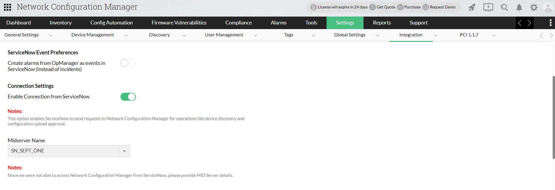 If NCM has been installed in a closed network and ServiceNow is not able to connect NCM, install the ServiceNow MID Server in the same network where NCM has been installed and select the appropriate MID Server name and click Save.