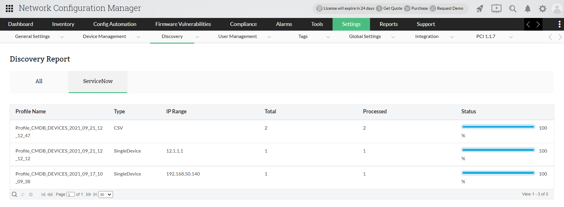 Using the ServiceNow integration, you can discover devices from the ServiceNow CMDB to NCM Inventory. To the view the status of discovery status of devices from the ServiceNow CMDB, go to Settings -> Discovery -> Discovery Report.