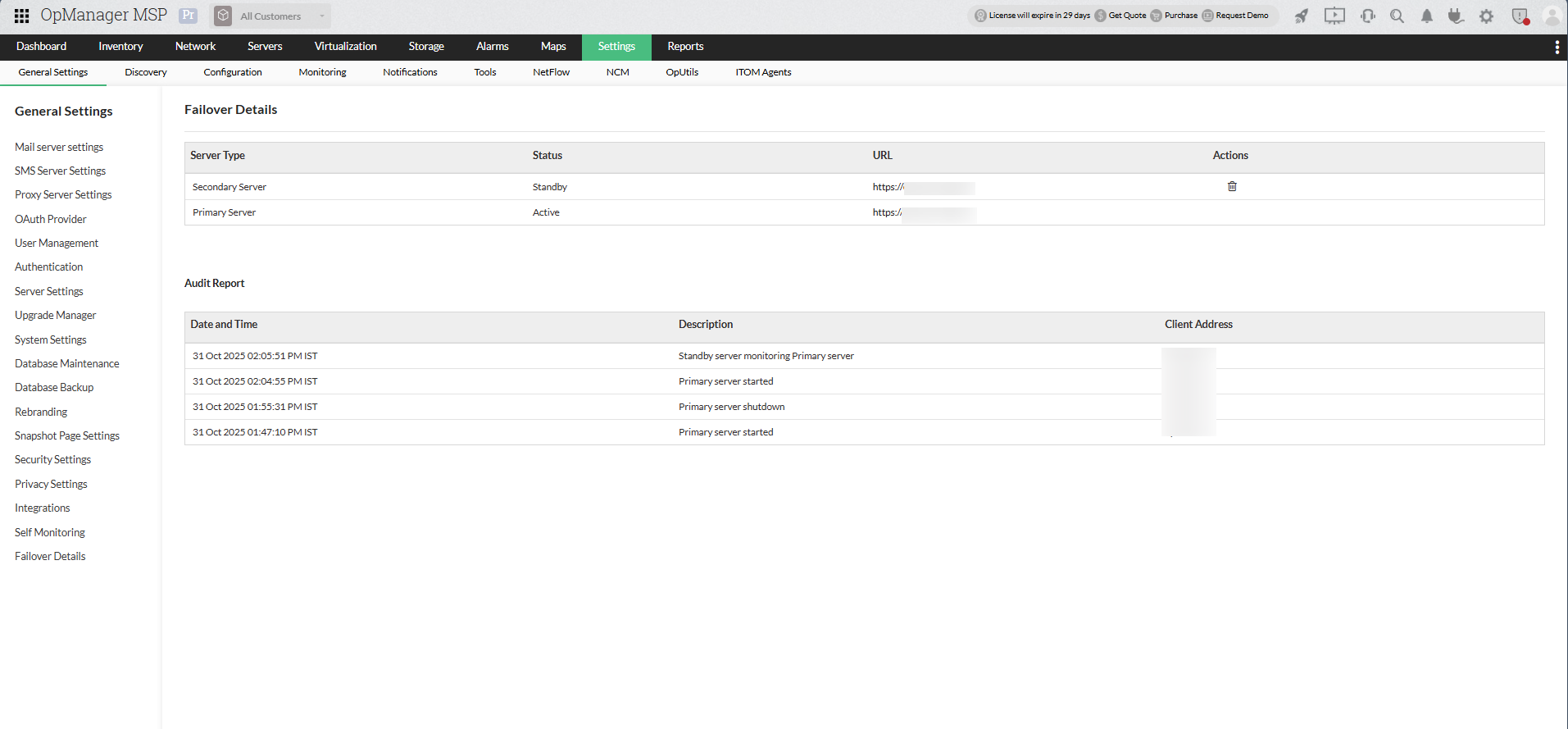 - In OpManager UI, navigate to Settings -> General Settings -> Failover Details.