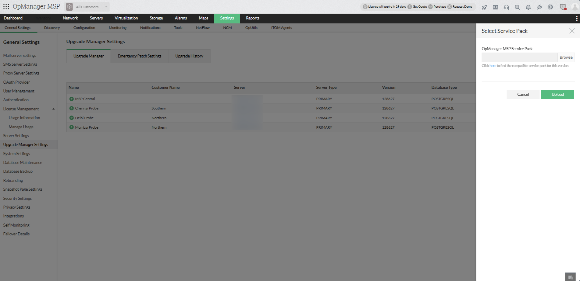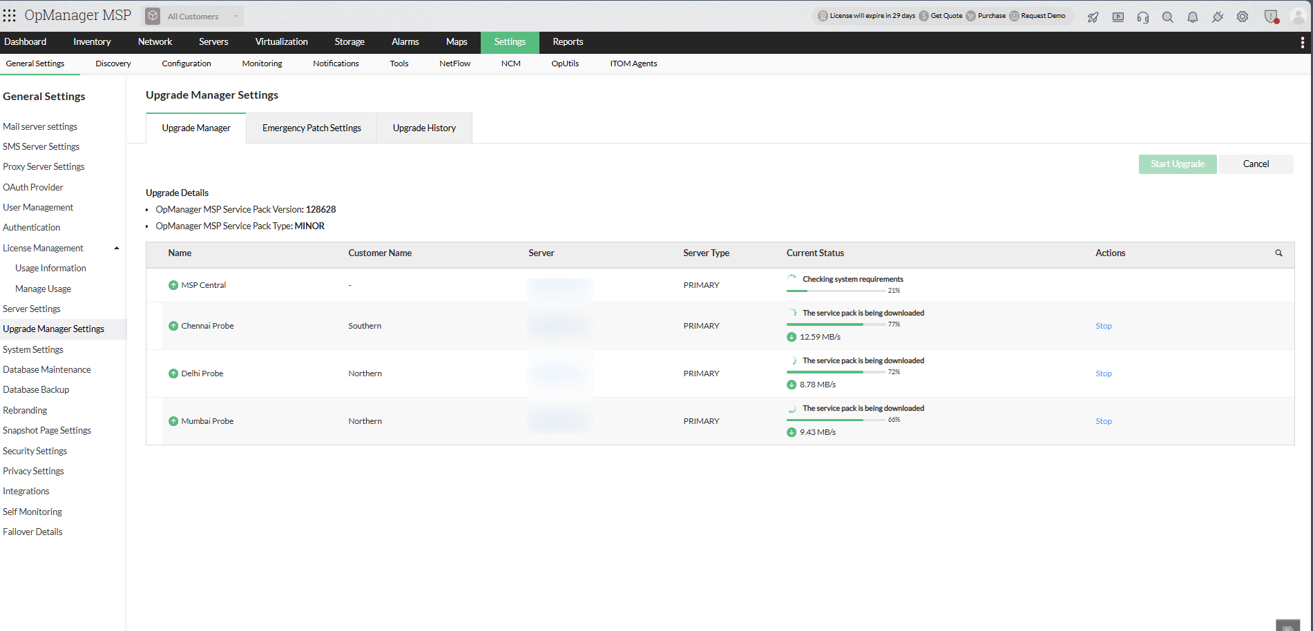 While downloading the service pack, if slowness or network issues is encountered, you can manually stop the download using the Stop button in the Actions column. In that case, manually copy the service pack to the <OpManagerProbe>\UpgradeManager directory for OpManager service packs. Use the Refresh button to fetch the latest status of the respective Probe service.