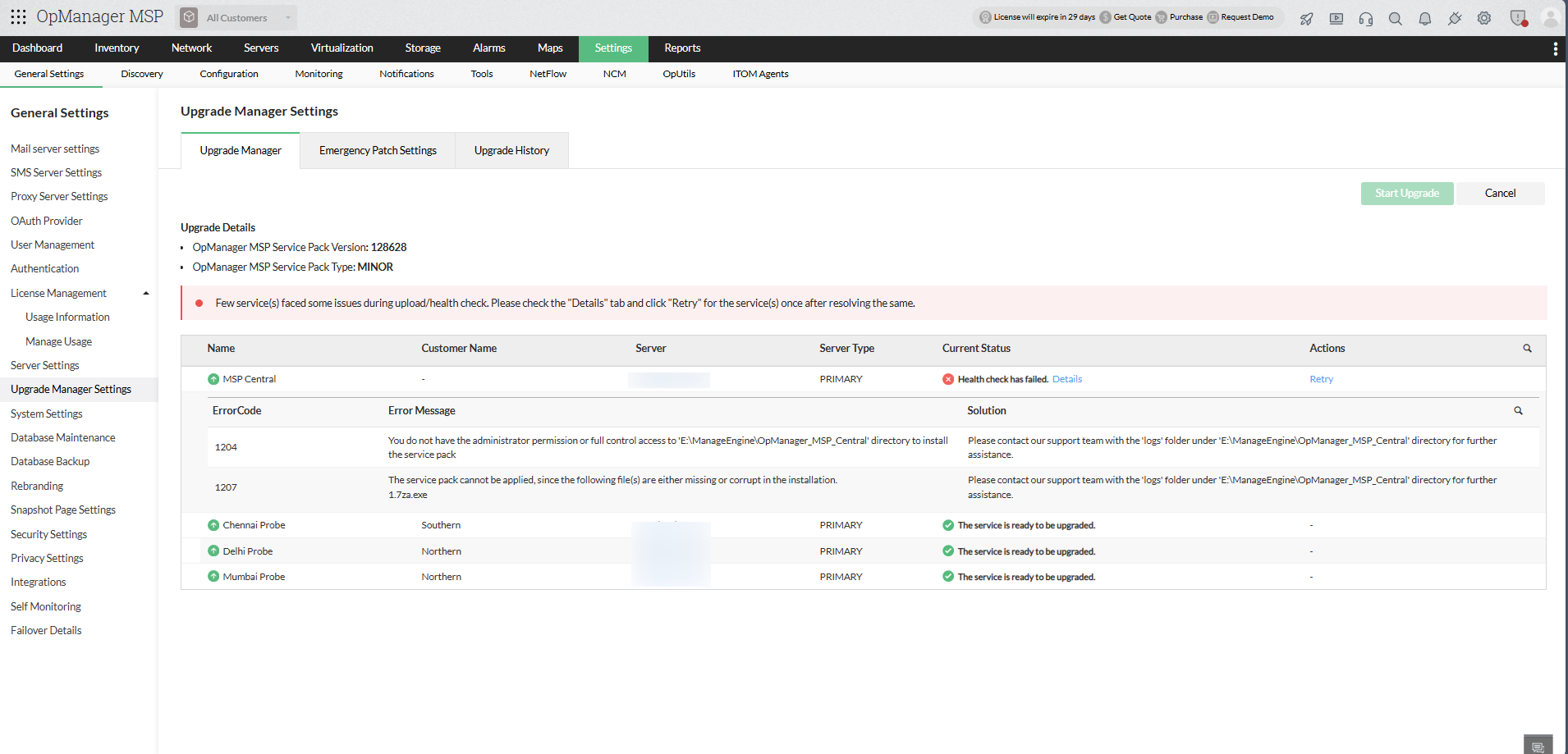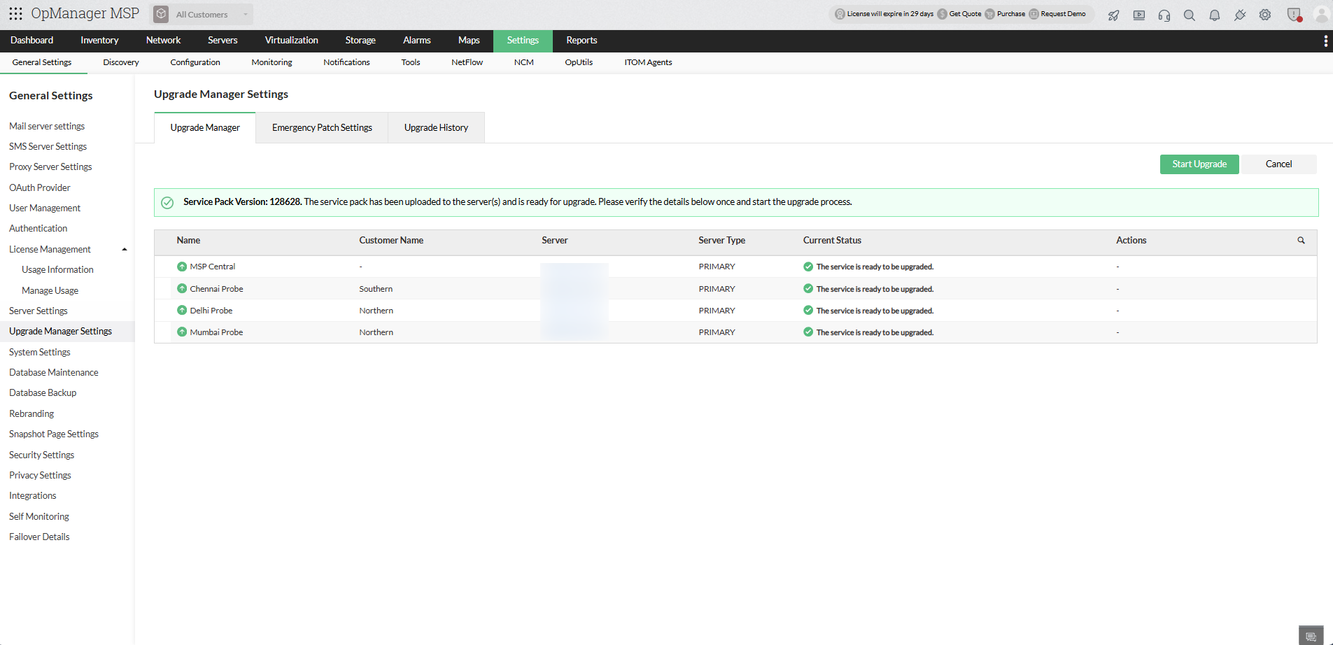 The upgrade process for OpManager - installed servers across your network is simplified using the Upgrade Manager. It offers a centralised platform to manage and perform upgrades for OpManager Central, Probes, their Failover servers. The enhanced smart upgrade feature helps to overcome the bottlenecks faced during the upgrade process.
