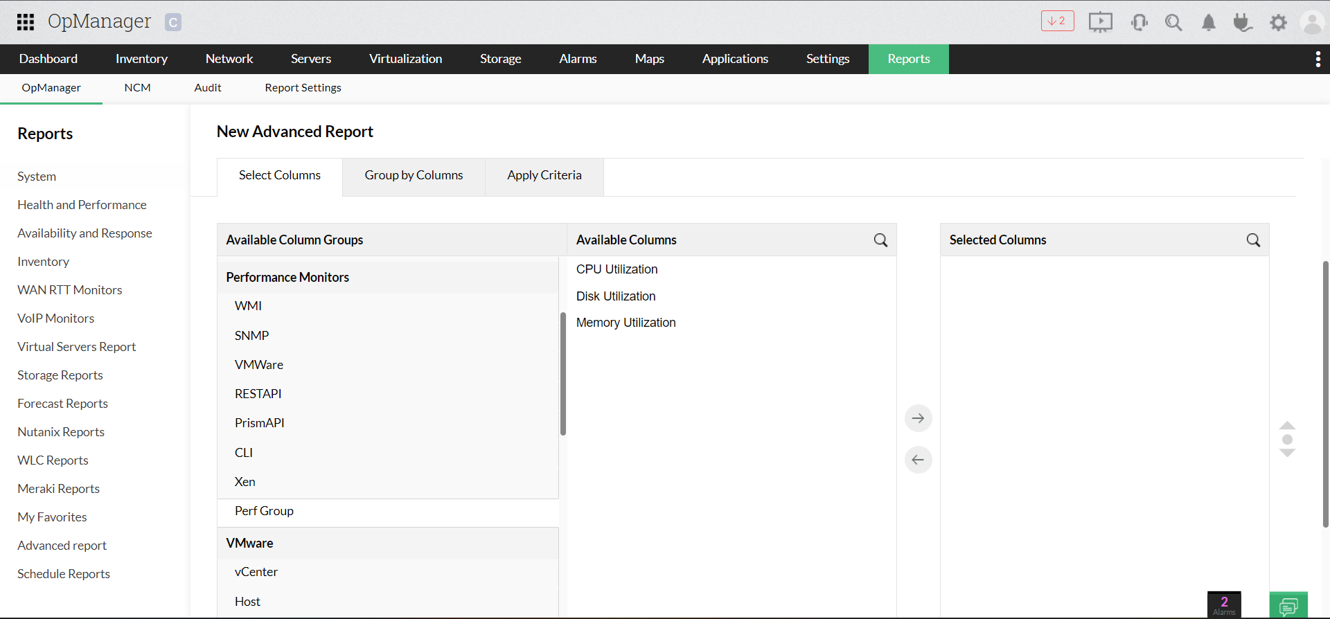 • Select your preferred parameter categories from the Available Column Groups. Within each parameter category, there are multiple properties. (Advanced reports give users the option to view inventory data and performance monitors in a single report.)