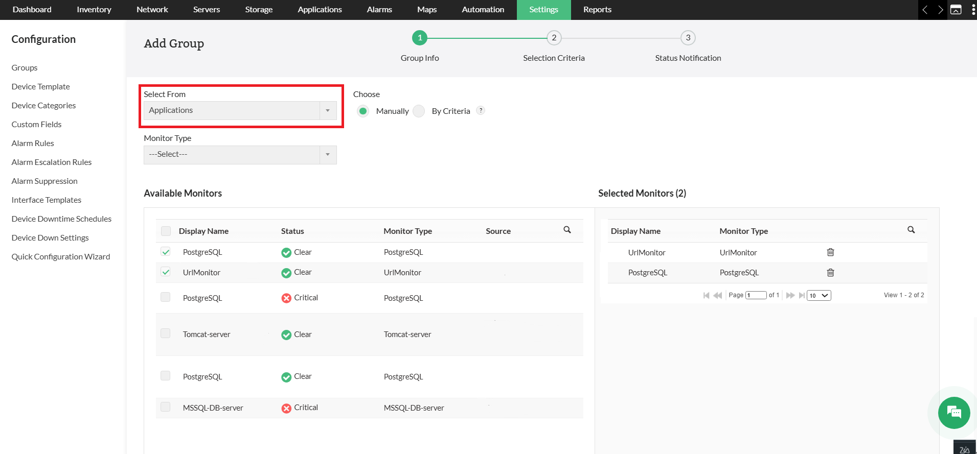 With the Grouping Application Monitors feature, you can group monitors from the APM plugin alongside devices for unified visibility. This gives you a consolidated view of both device and application health from a single console. To group application monitors in OpManager: