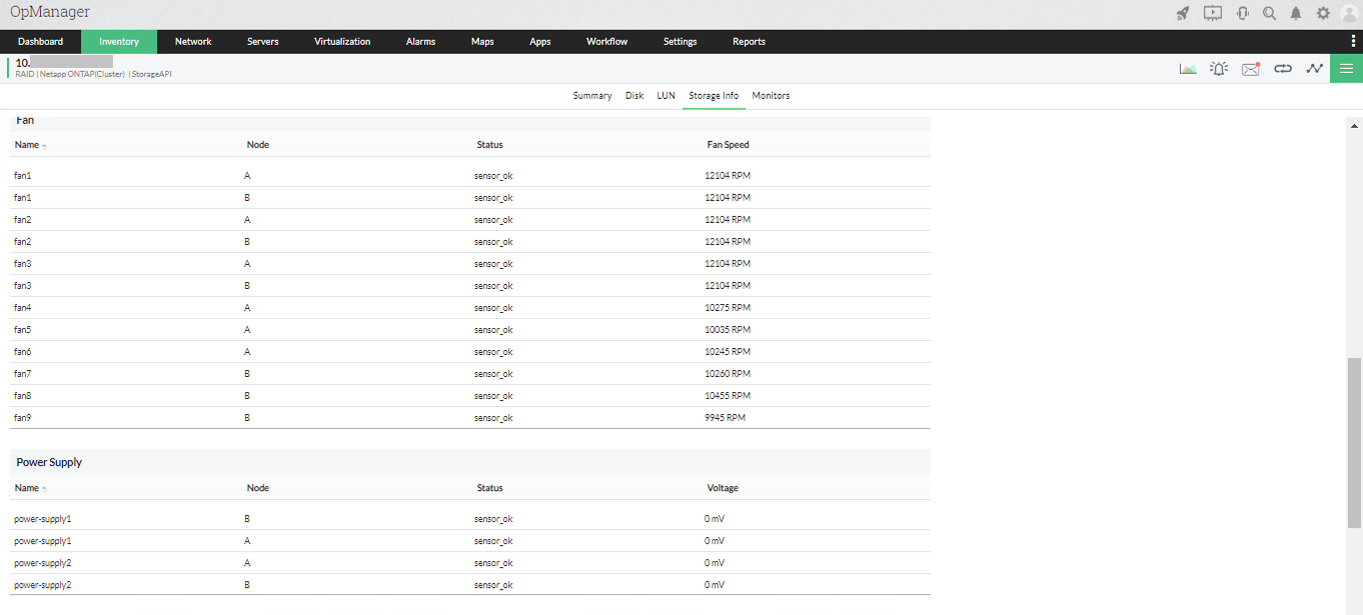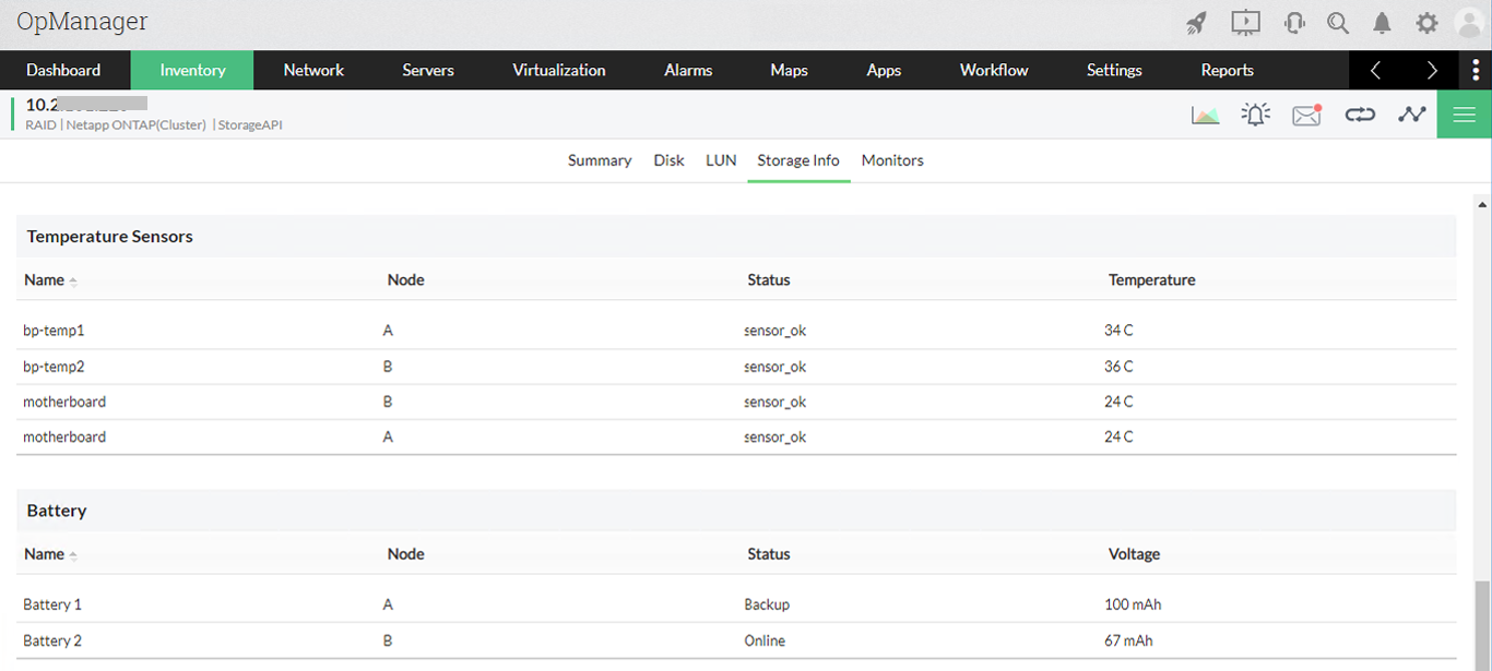 With OpManager, go the extra mile and monitor the supplementary attributes of your NetApp storage appliances; check the status and functioning of power supplies and associated batteries that help power those appliances, and track the status of hardware and hardware sensors to ensure robust functioning on a holistic level.