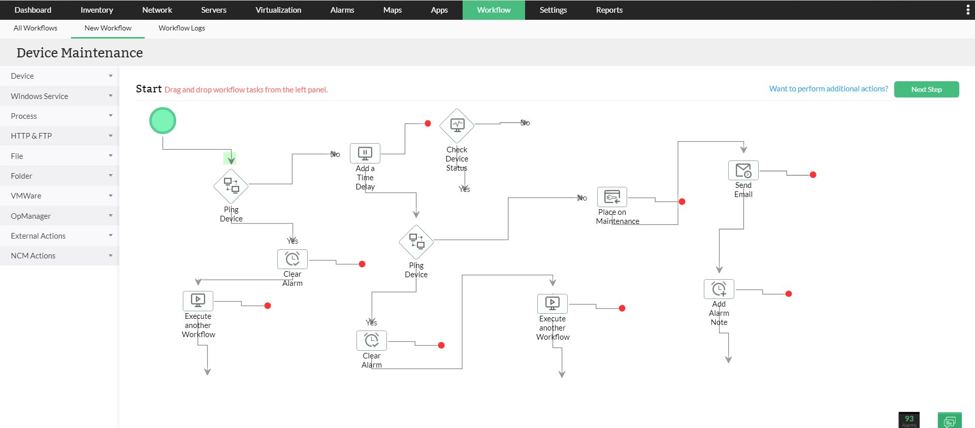IT workflow automationis a powerful and adept network troubleshooting automation tool that executes Level 1 troubleshooting and repetitive maintenance tasks based on predefined workflows. The network administrator can easily drag-and-drop actions into the workflow builder to create a troubleshooting flow. This will initiate step-by-step troubleshooting for network faults on a regular basis based on the scheduled time or when alarms are triggered on associated devices or groups.