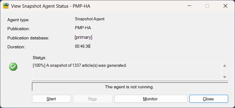 Right-click on Publication and click View Snapshot Agent Status. You will see the below window showing the progress of snapshot creation, and the process takes a few minutes. Close the window once the snapshot is successfully generated. You can also Start the agent or Monitor it by clicking the respective buttons.