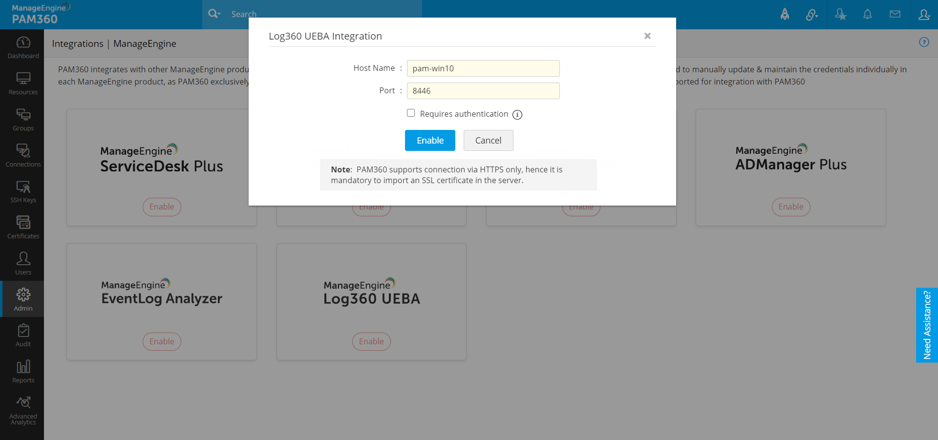 Change the connection type to HTTPS in the Log360 UEBA server. The integration works only with HTTPS connections as PAM360 uses HTTPS to secure remote connections. Click here to learn how to change the connection type in the Log360 UEBA server. Once you change the connection type, follow the steps given in this document to generate and apply an SSL certificate in the Log360 server.