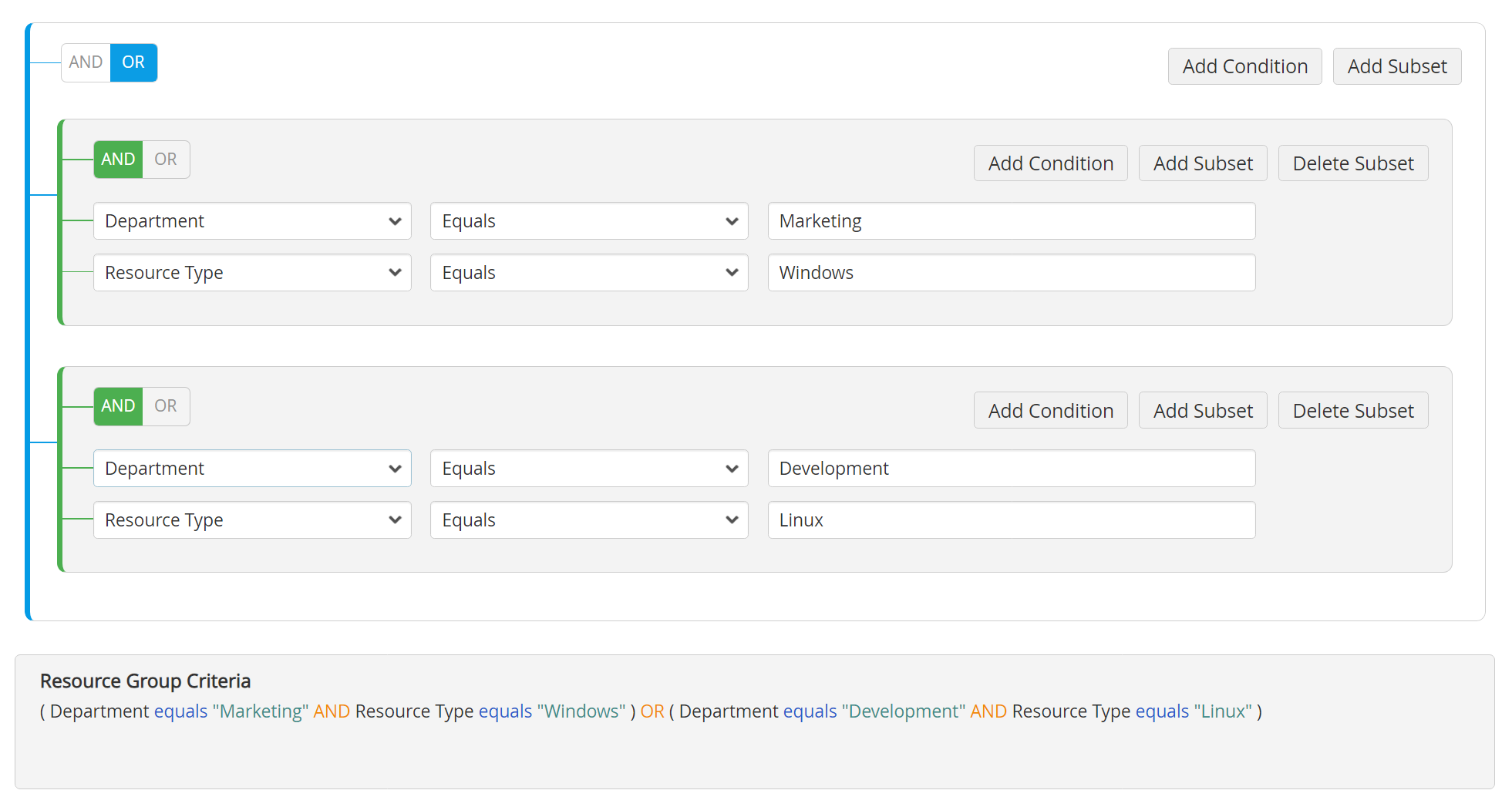 Scenario 1: A system administrator in an organization needs to create a resource group that includes only the Windows resources from the Marketing department and the Linux resources from the Development department. This will enable the administrator to efficiently manage and execute operations across these resources with a single click.