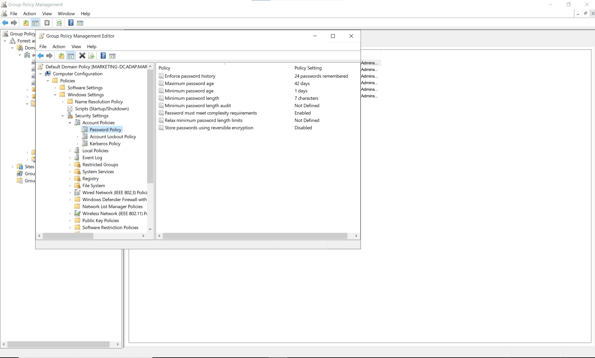 - In the Group Policy Management Editor, navigate to Computer Configuration > Policies > Windows Settings > Security Settings > Account Policies > Password Policy.