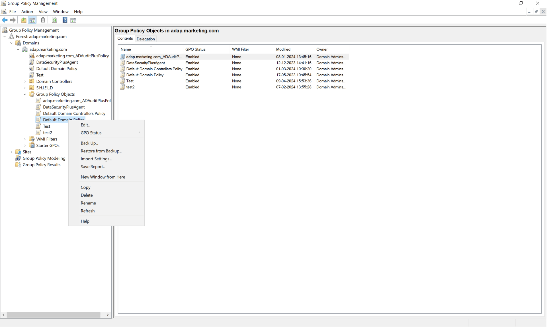 - Right-click Default Domain Policy (or any other policy that is linked to the root domain) and select Edit.