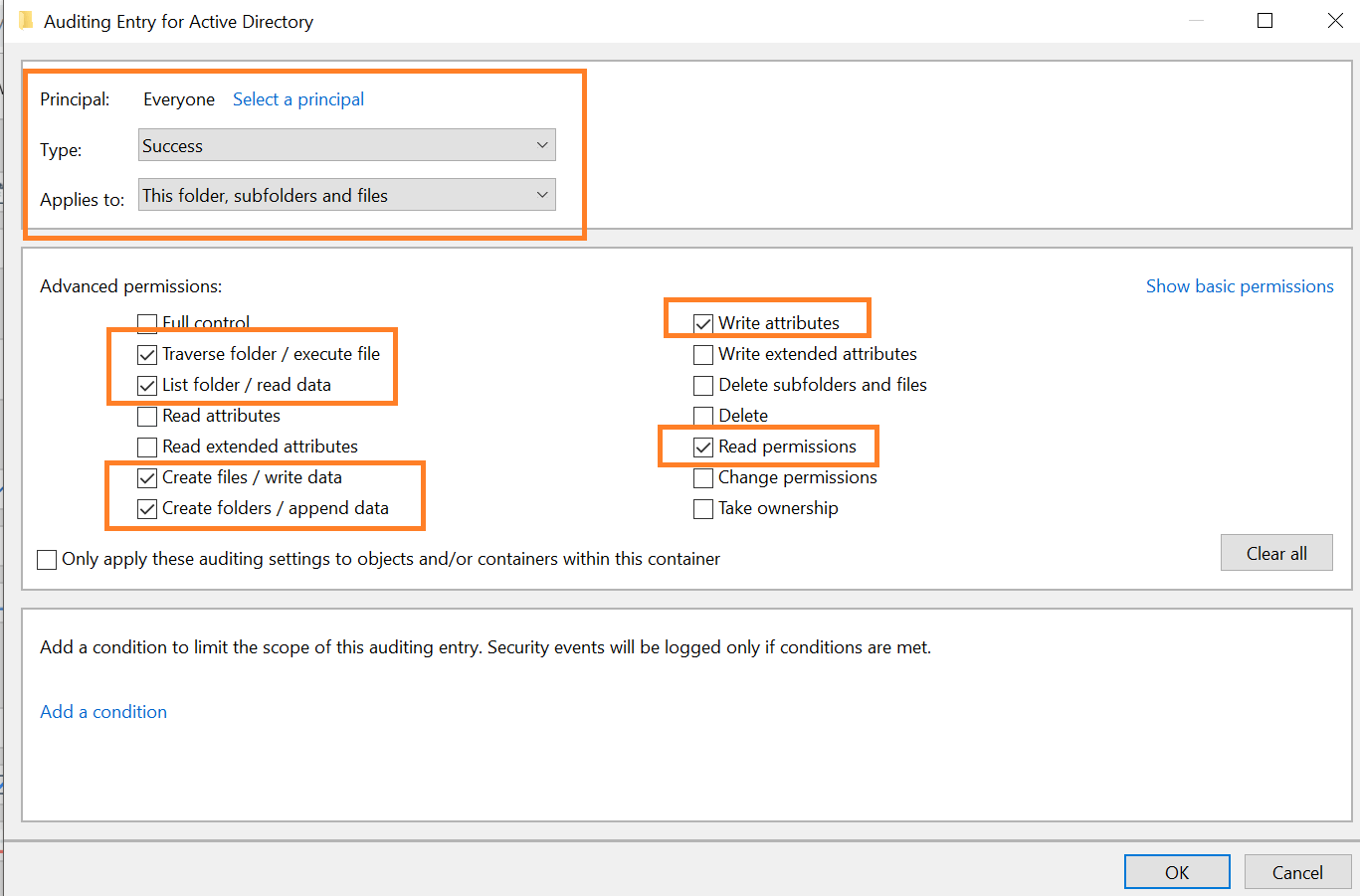 In the Auditing Entry for Active Directory dialog box, enter the following details: