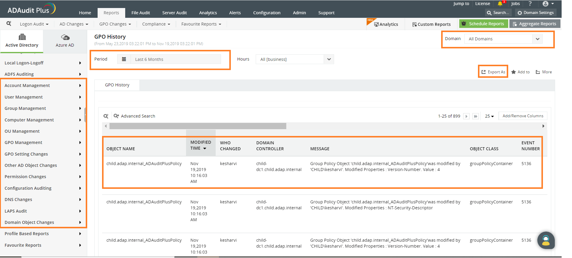 Log in to ADAudit Plus and navigate to the Reports tab. You will find a list of reports, each with their own subcategory of reports pertaining to the corresponding AD object. All these reports can be generated for any domain in your network within any time frame of your choice and can be exported as well.