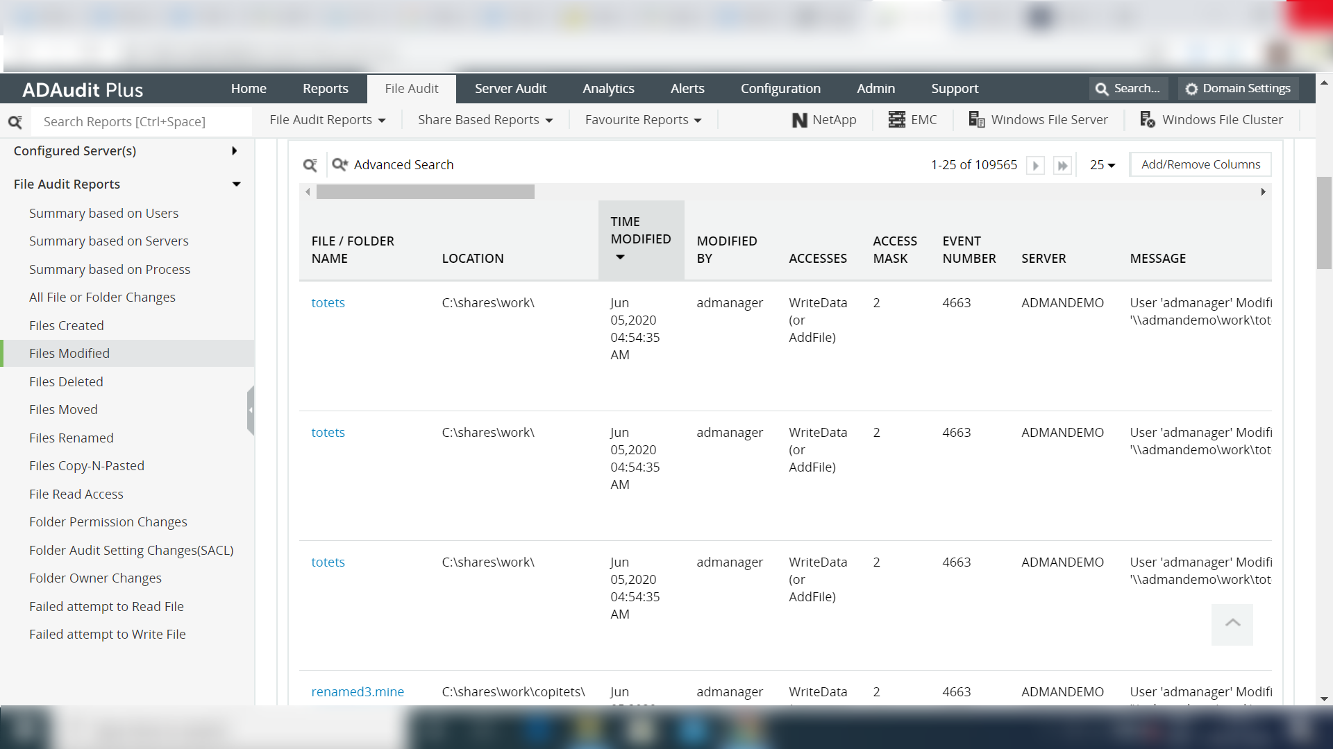 A comprehensive report in ADAudit Plus on who modified files in Active Directory