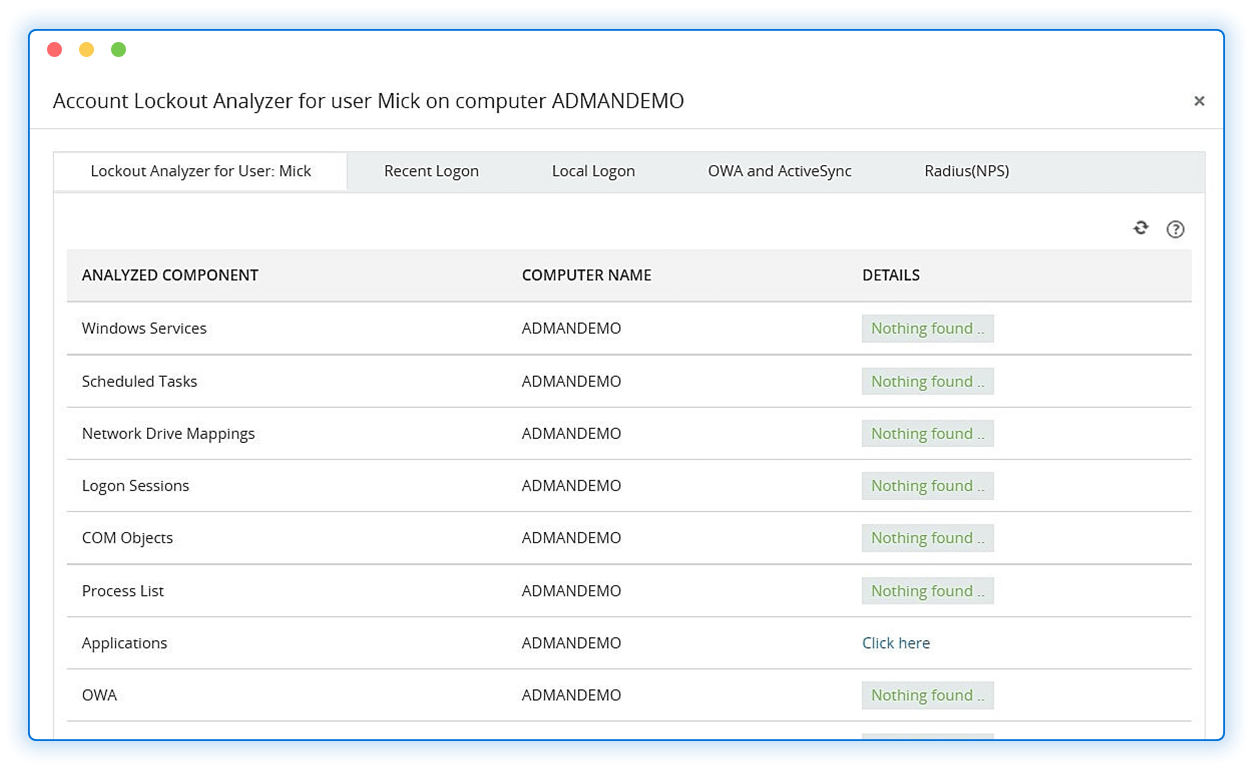Pinpoint the reason behind each lockout easily by tracking users' recent logon details, and analyzing various Windows components, including network drive mappings and processes.