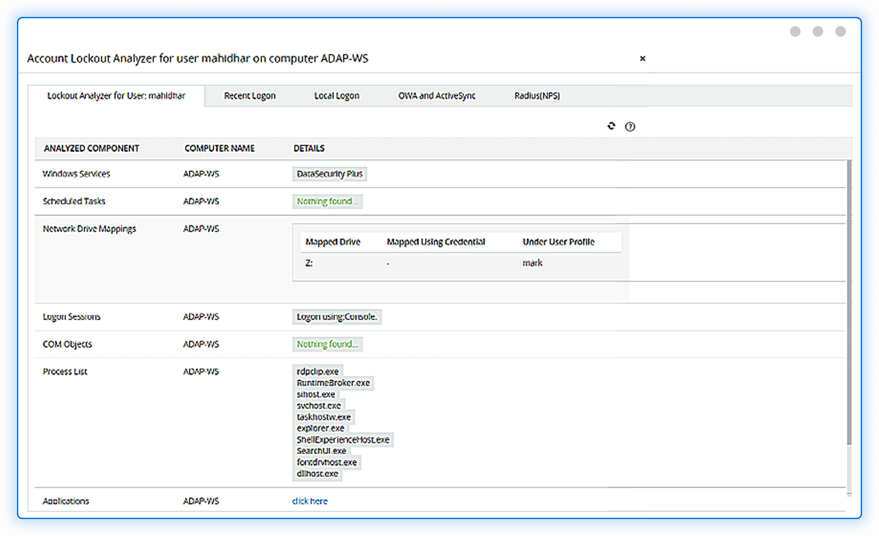 Identify the source of lockouts by analyzing an extensive list of Windows components like services or Remote Desktop Protocol sessions.