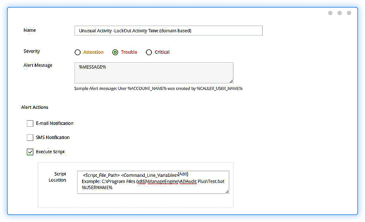 Receive real-time account lockout notifications via email and SMS with details on the locked-out user, machine, and more.