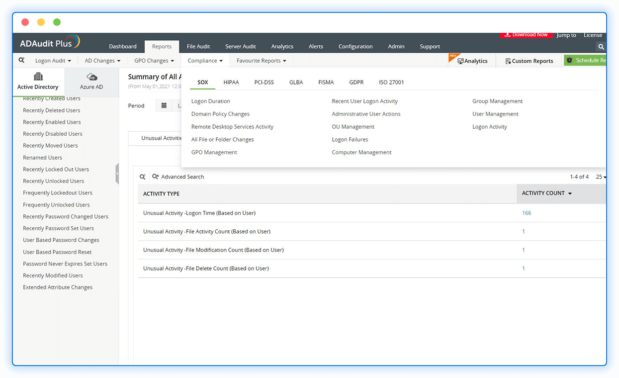 Use over 200 audit reports to meet the various compliance requirements of the GDPR, PCI DSS, HIPAA, SOX, FISMA, GLBA, and more.