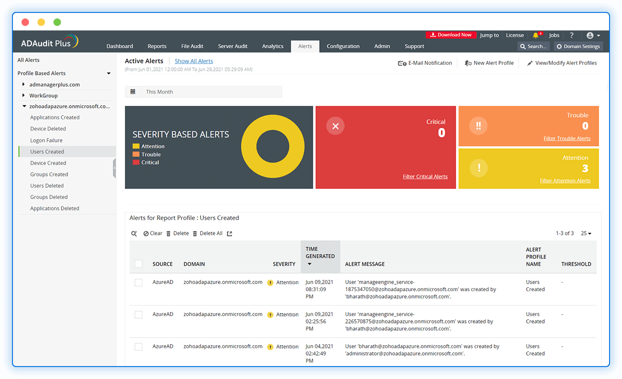 Audit user management actions; monitor the creation, deletion and modification of user objects; and get detailed information on password changes and resets.