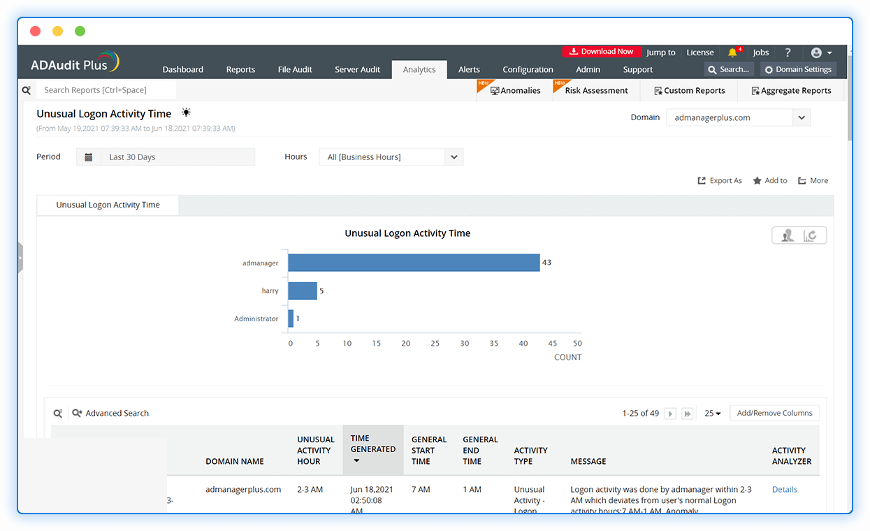 Leverage user behavior analytics to establish logon activity patterns and scrutinize anomalous logons to subdue insider threats.