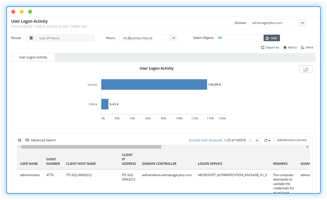 Monitor logins across domain controllers, Windows servers, and workstations in real time with consolidated reports and alerts.