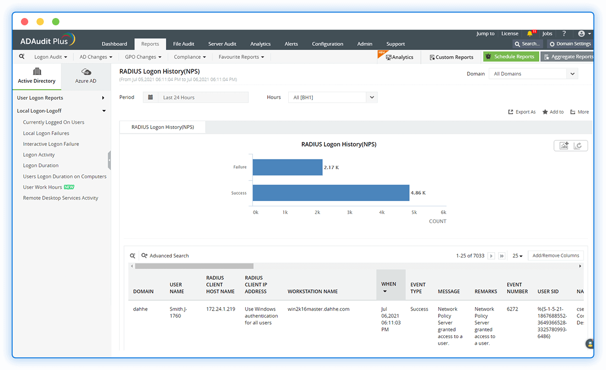 Audit and analyze users logging in to local machines via RADIUS (NPS) and Remote Desktop Services activity.