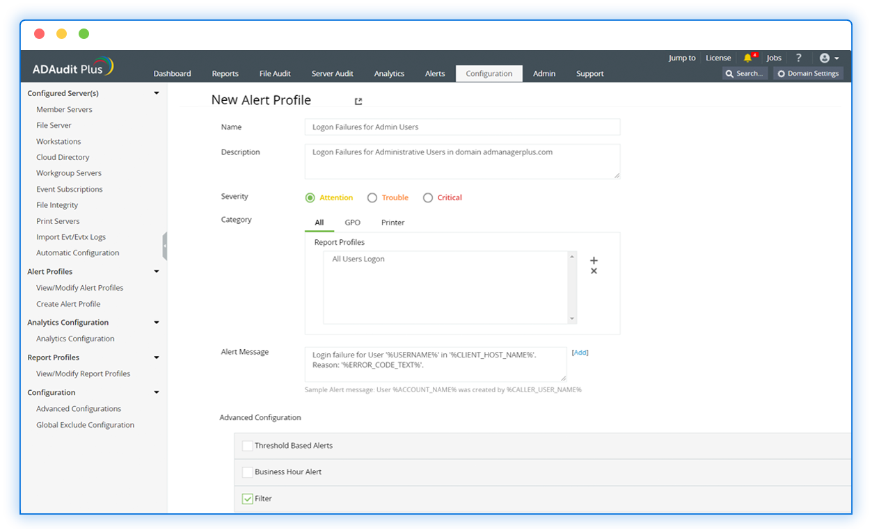 With over 250 preconfigured reports on Group Policy, privilege use, object changes, compliance, and more, ADAudit plus provides deep insights into your AD activities.