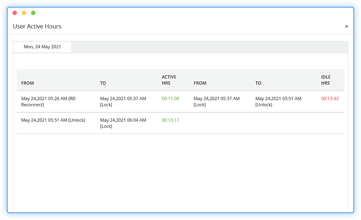 Know the idle and active hours for each user by tracking system shutdowns, screensavers, logons, and more.