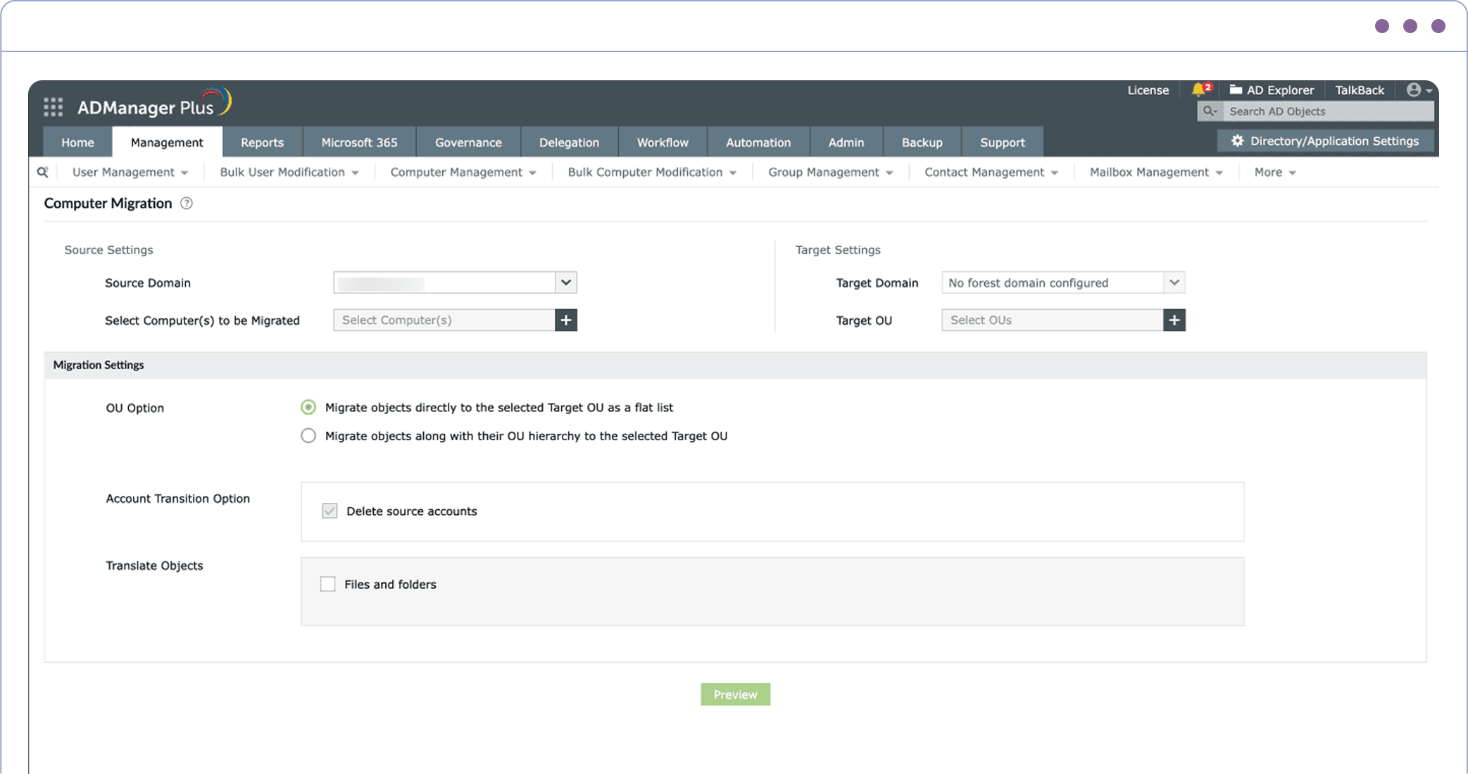 Migration can be quite risky and its challenges increase with the complexity of an organization's AD infrastructure. ADManager Plus, an identity governance and administration (IGA) solution, doubles as an AD migration tool and aids in securely migrating AD objects. With ADManager Plus, organizations can seamlessly migrate users, groups, contacts, and GPOs across the domains and forests in your AD network.