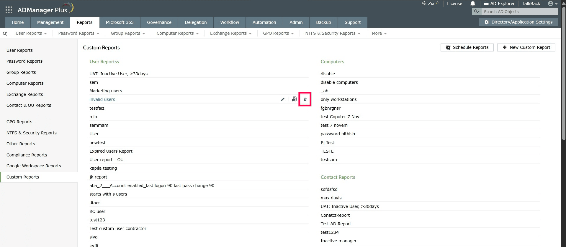Delete custom reports using the delete icon found beside the report name, as shown in the figure below.