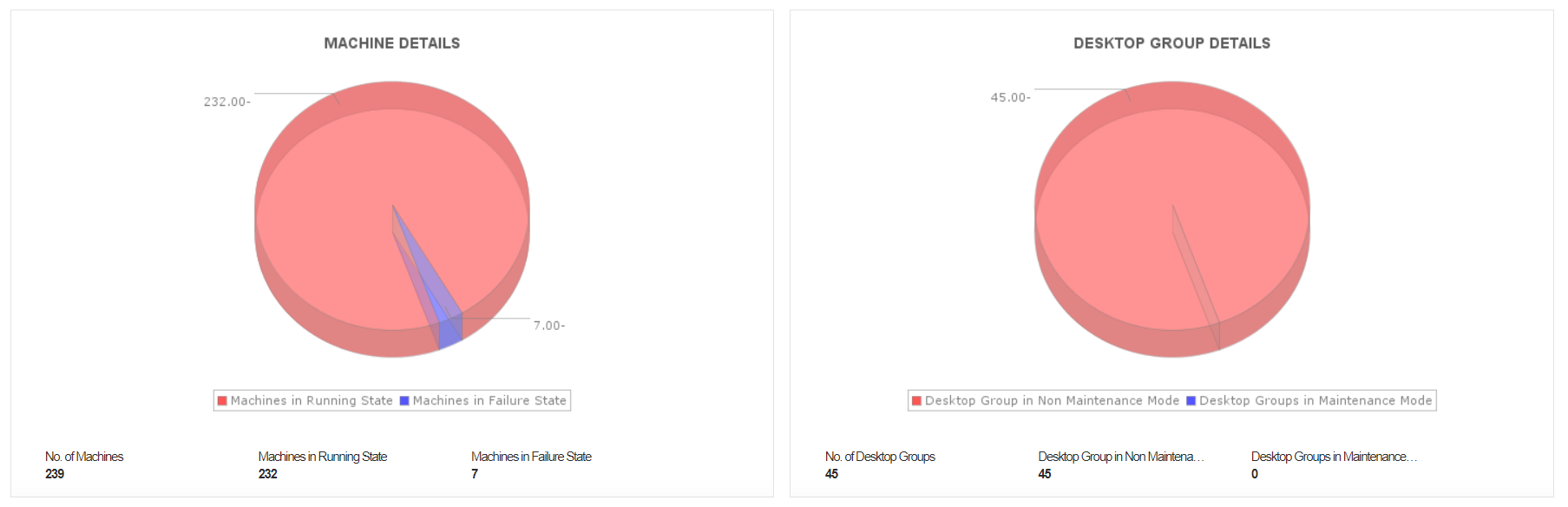 With Applications Manager's Citrix Virtual apps and desktops service monitoring, get an overview of machines applications at a single glance. Become aware of machines in failure state, identify disconnected sessions and track desktop groups in maintenance with easy-to-interpret graphs.