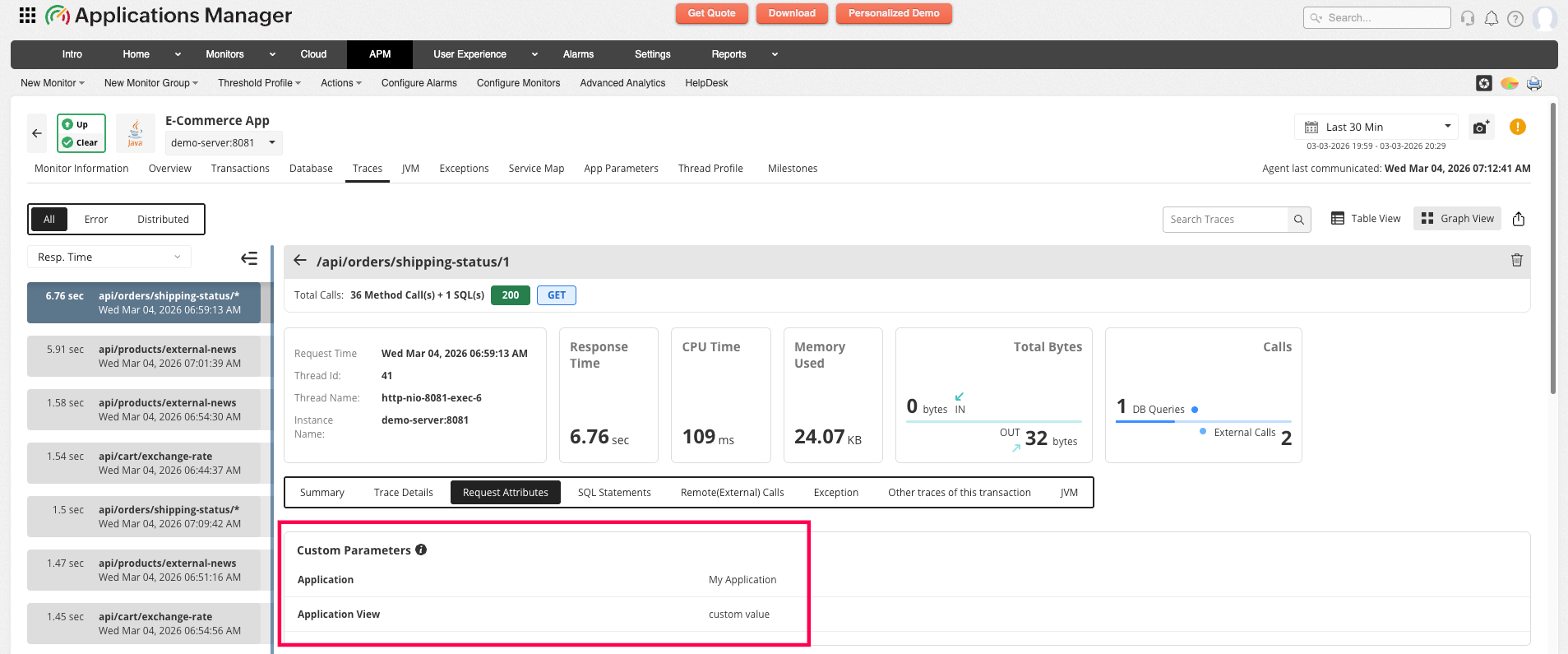 To give contextual meaning to traces, you can add additional parameters which can help you identify the context of the transaction trace. Contextual metrics can be anything, a session id, user id or certain method parameters which can help you identify the specific information about a transaction trace. You can add a maximum of 10 parameters to a transaction trace, these parameters can be viewed under Trace Summary.