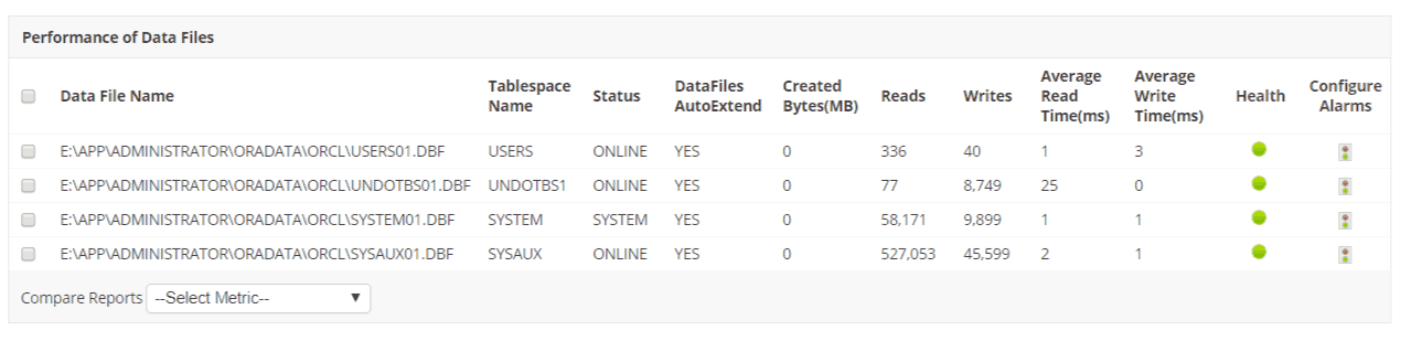 ManageEngine Applications Manager provides indepth Oracle Monitoring capability in addition to providing Oracle datafile monitoring. An Oracle DBA can monitor datafiles and track data growth by using the Web Client provided by Applications Manager. While Oracle tablespaces are the logical structures, datafiles are the physical structure where data is actually stored by the Oracle Database. A tablespace may point to one or more data files where the data is physically stored. It is hence important for the database administrator to monitor datafiles in addition to monitoring tablespace for ensuring smooth functioning of production databases.