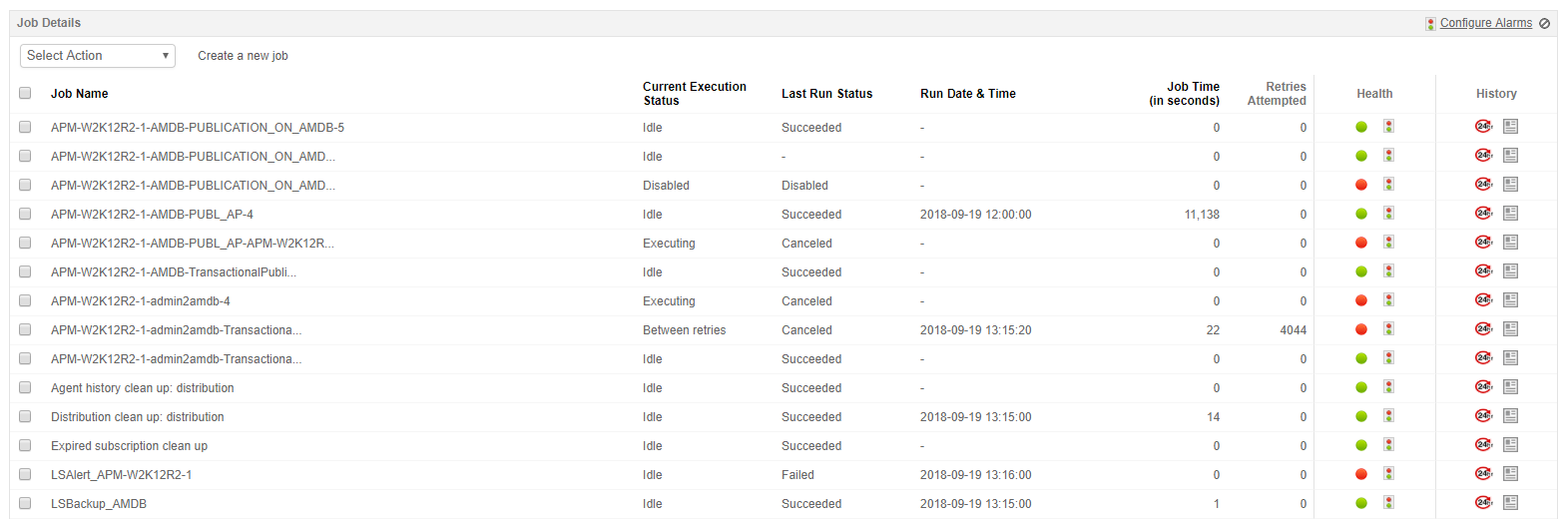 Applications Manager's SQL server database monitoring capabilities help you trace problematic SQL sessions down till query, identify resource intensive session(s) and troubleshoot any issues that arise due to any session consuming excess resources or in case of session overload. The SQL server performance monitor allows you to keep track of the jobs that are scheduled to run, the last outcome of jobs that have run during the current session and to find out the current status of individual jobs.