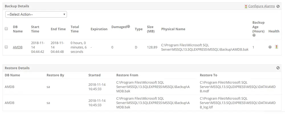 Data loss can be catastrophic to businesses and taking backups of your database is an inevitable part of SQL server performance monitoring. With Applications Manager's SQL performance monitor, you can save and retrieve all your essential data with the help of Backup/Restore feature. The SQL performance monitor lets you track the total time taken, along with their start and end time, allowing users to keep a close watch on your backup durations.