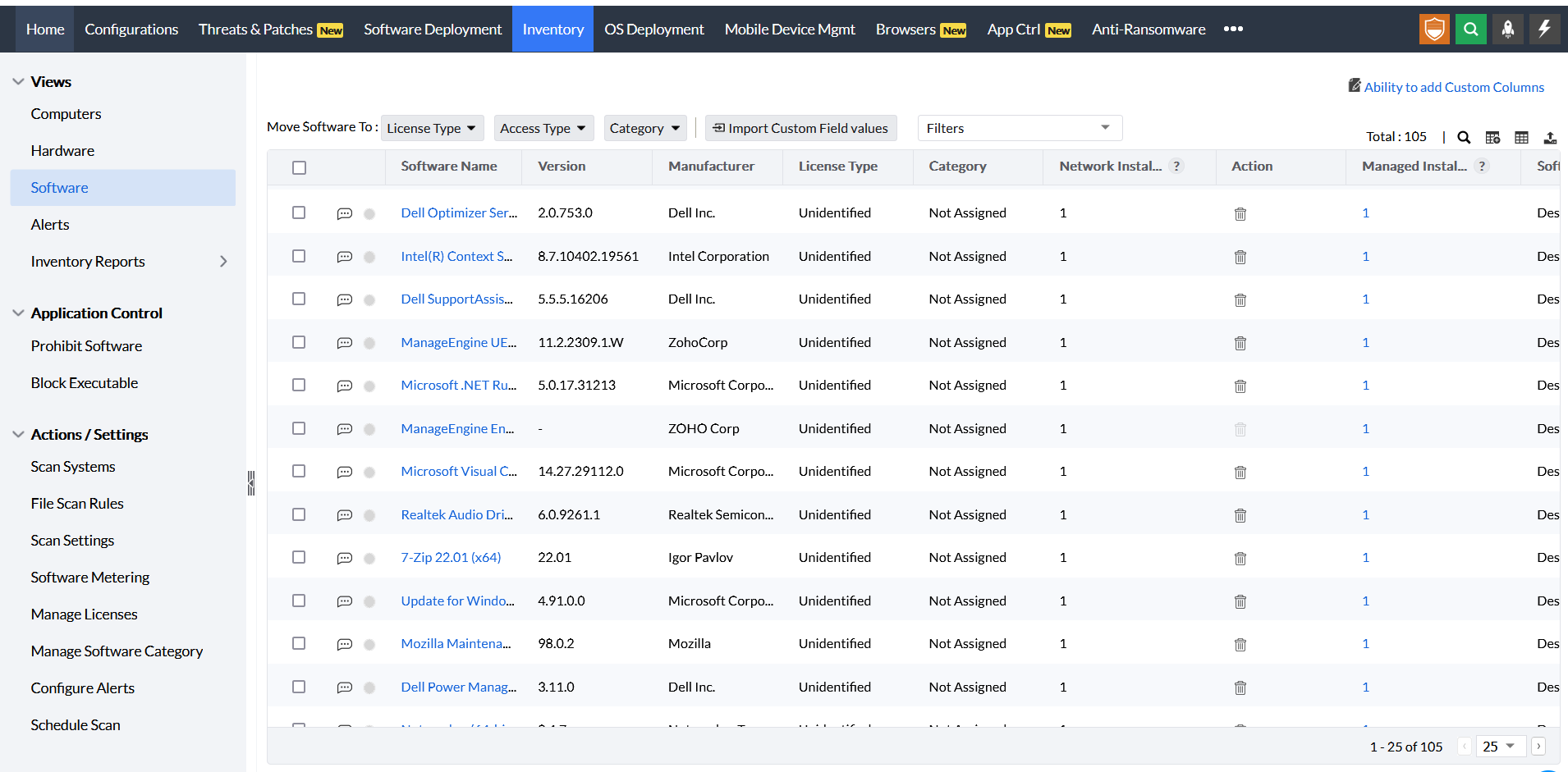 Software inventory management is the tracking and recording of all software and applications that are installed or uninstalled in your network. It is an integral part of IT asset management. Endpoint Central's IT asset management software periodically scans all the Windows, Linux and Mac computers and servers in a network to collect and store software and hardware inventory details. This data is presented in the form of reports with details about software along with the usage metrics for each computer/user which can exported in PDF and CSV. Get started with Endpoint Central's free software inventory tool today!