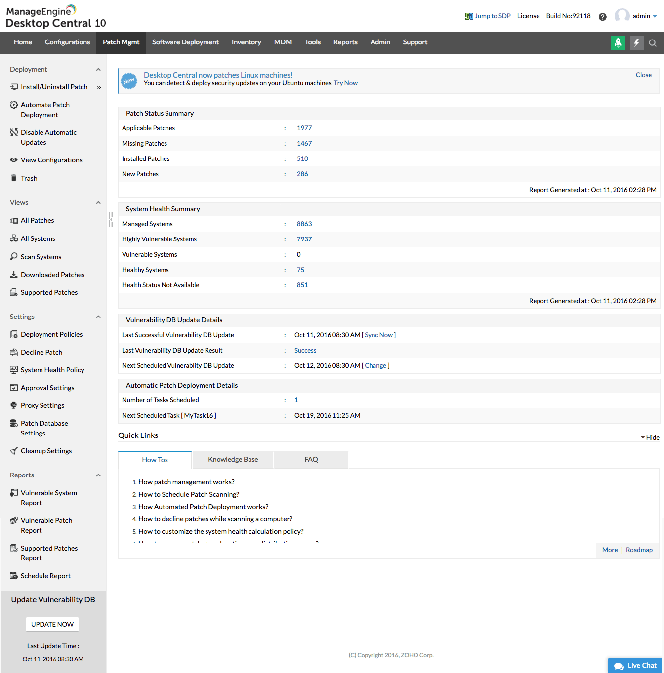 Patch management dashboard that gives you insights on your network in one go Patch-based view System based view: Allows you to identify Healthy, Vulnerable and highly vulnerable systems at a glance Deploy patches manually or schedule the deployment at off hours Deployment policies that give you granular control over patch deployment Test and approve patches before deployment: manually or automatically Set it and forget it: Automate the complete patch management lifecycle with comprehensive customization optionsNumerous pre-defined pach reports that can be scheduled, shared or downloaded easily