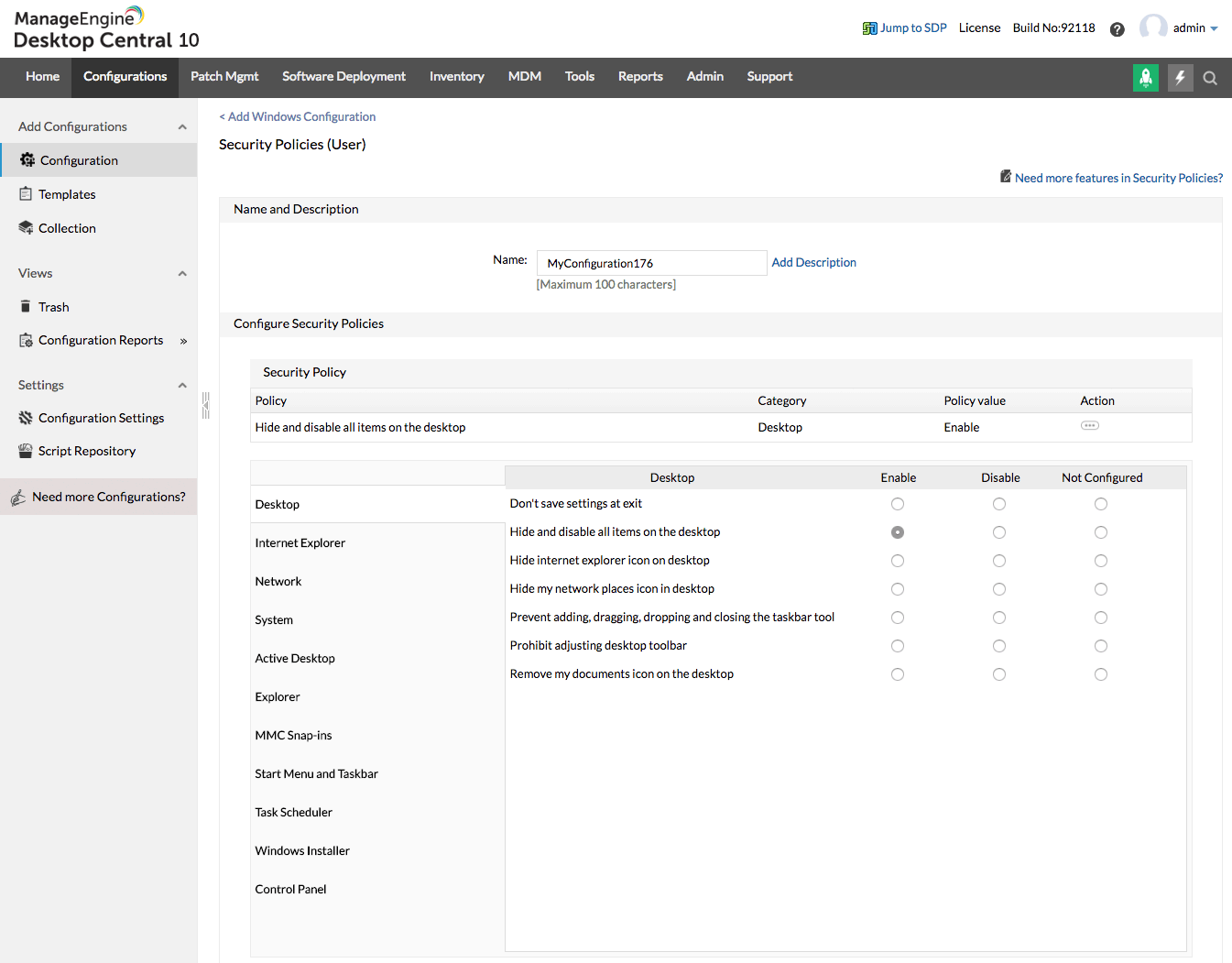 Windows Security Policies are a set of configurations that can be applied on desktops to enhance security. Security policies determine the various security restrictions that can be imposed on the users in a network. The security settings for Active Desktop, Computer, Control Panel, Explorer, Internet Explorer, Network, and System categories can be defined using Security Policies Configuration.