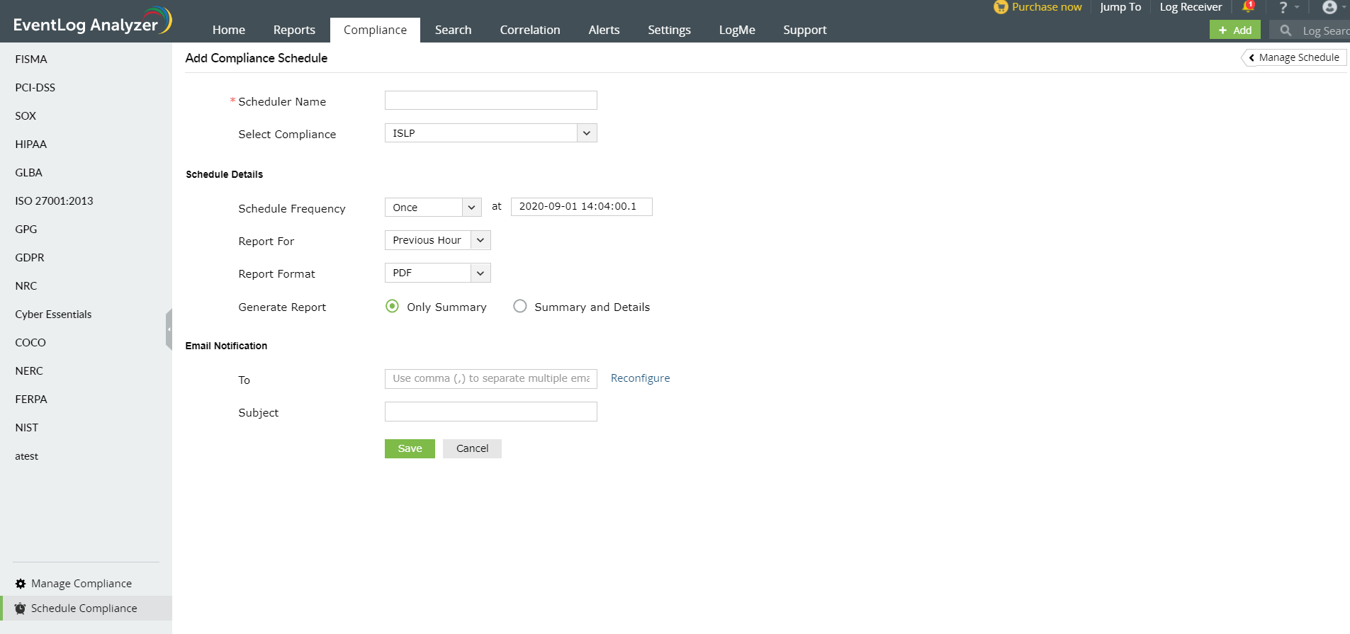 EventLog Analyzer allows you to customize and schedule the existing predefined compliance report in order to meet the unique internal security policy requirements that are concerned with your enterprise/industry. You can modify the existing compliance report by adding/removing the default event report lists. You can also select specific log sources/users for whom the compliance reports have to be generated.