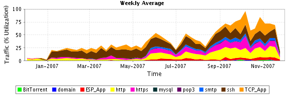 He then looks at the overall application distribution for this period and sees that the increase in this link utilization has been contributed almost entirely due to the http and https traffic that he diverted through this link from another link towards the end of May 2007. Most of the other applications are not using much more than their baselined levels.