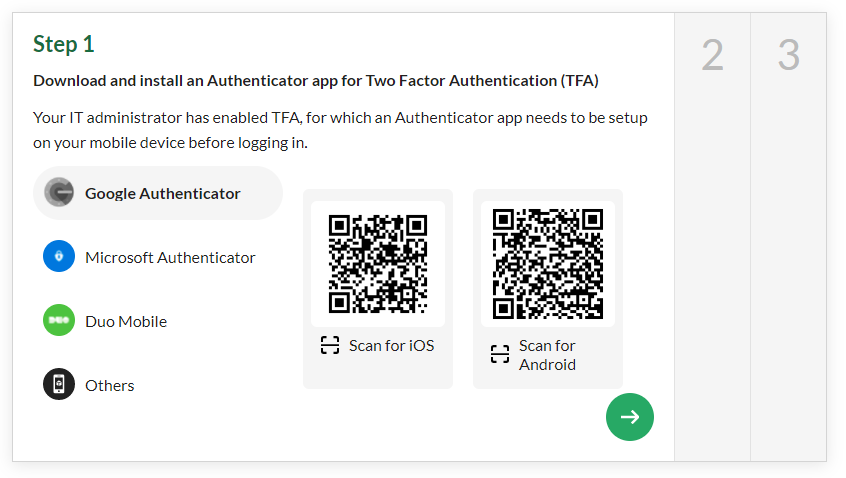 If 'Authenticator Apps' is chosen as the mode of Authentication, all users will be prompted to set up their Authenticator app during their next login.
